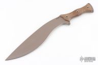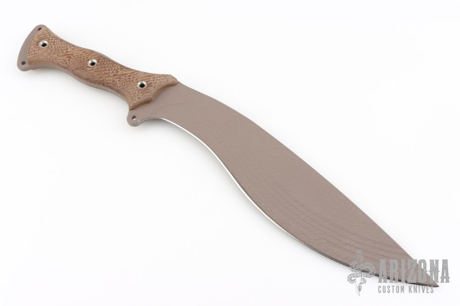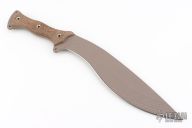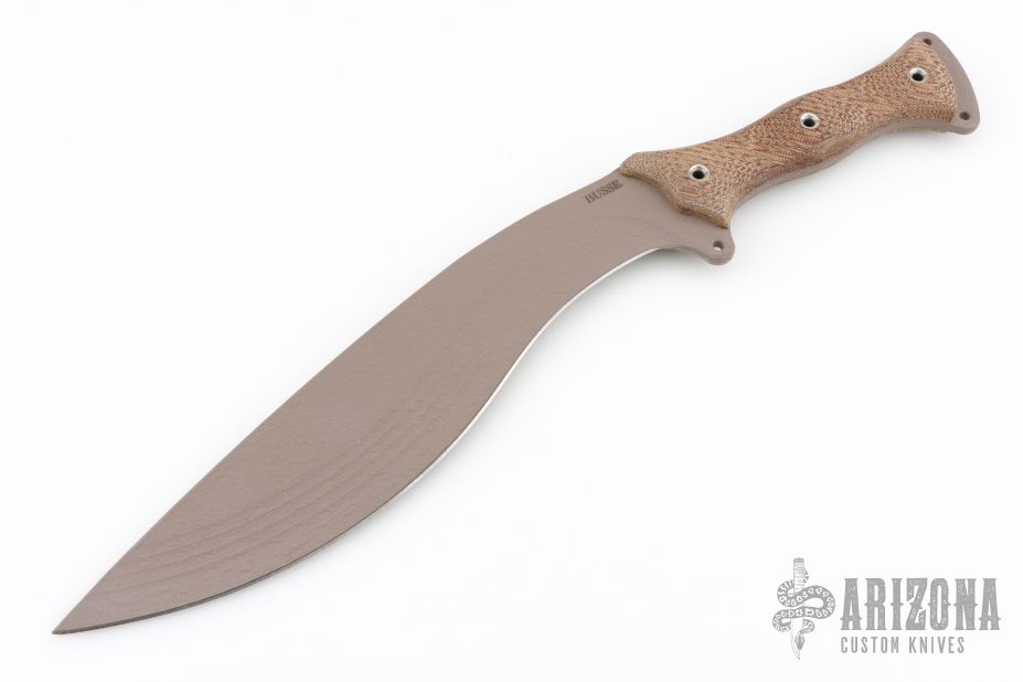 This HUCK Kukhuri from the Busse features a tan coated corrugated bevel blade, .232" blade stock, 2.567" blade depth at its widest point. Full tang construction with brown micarta covers, and tube pins. Excellent condition.