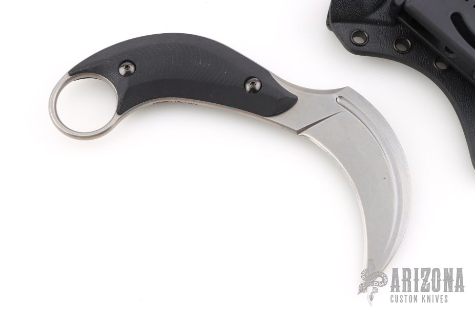 This B.A.K. by Bastinelli Knives features a stonewashed N690 blade with fullers and a false top edge, .158" blade stock and 1.192" blade depth, full tang construction. The handle has a black G-10 scales. Comes with a kydex sheath with belt clip. Excellent condition.