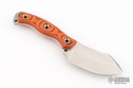 This Custom Shop Mini Muk by Busse Knives features a satin finished blade with .225" blade stock and 1.535" blade depth, full tang construction. The handle has orange/black G10 covers, tubes, and lanyard hole in pommel. Excellent condition. Limited Release.