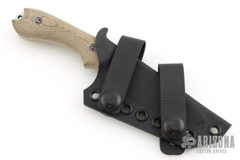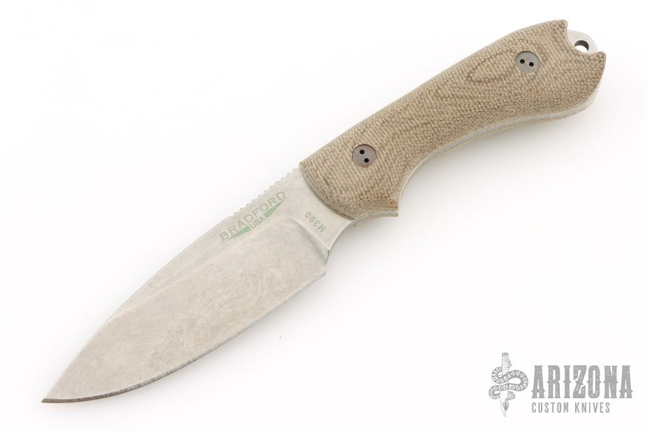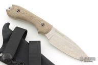 This Guardian3 by Bradford Knives features a stonewashed drop point blade with swedge and notched thumbrest, .142" blade stock and 1.065" blade depth. The handle has natural canvas micarta scales over full tang construction. Exposed tang pommel with lanyard hole. Includes a kydex sheath. Excellent condition.