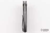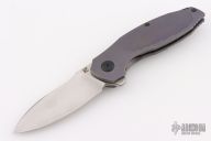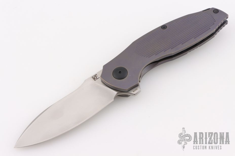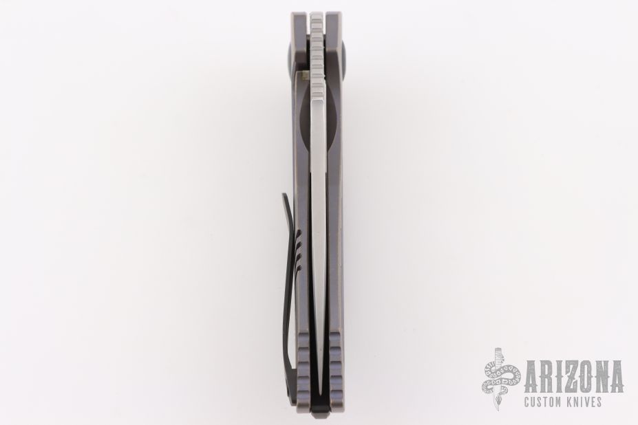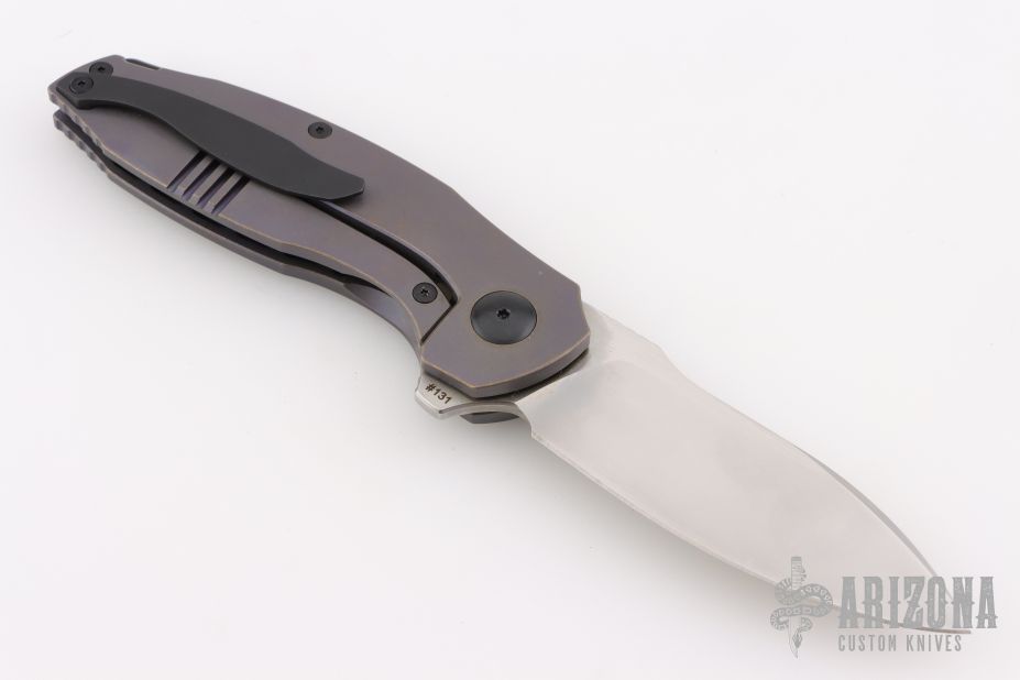 This Baugi model features a bronze and purple anodized titanium handle and a two-tone finished blade. It was designed by Anton Malyshev to serve all of your EDC needs. The flipper blade opens gracefully on a ceramic bearing pivot and locks up solid with a steel reinforced titanium frame lock. A anodized titanium pocket clip and black backspacer finish of this impressive Malyshev design. Comes with original zippered case, extra hardware and clip, and COA dated 2018 and s/n 131. Excellent condition.