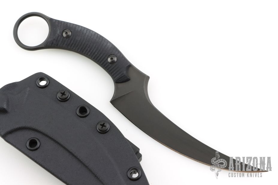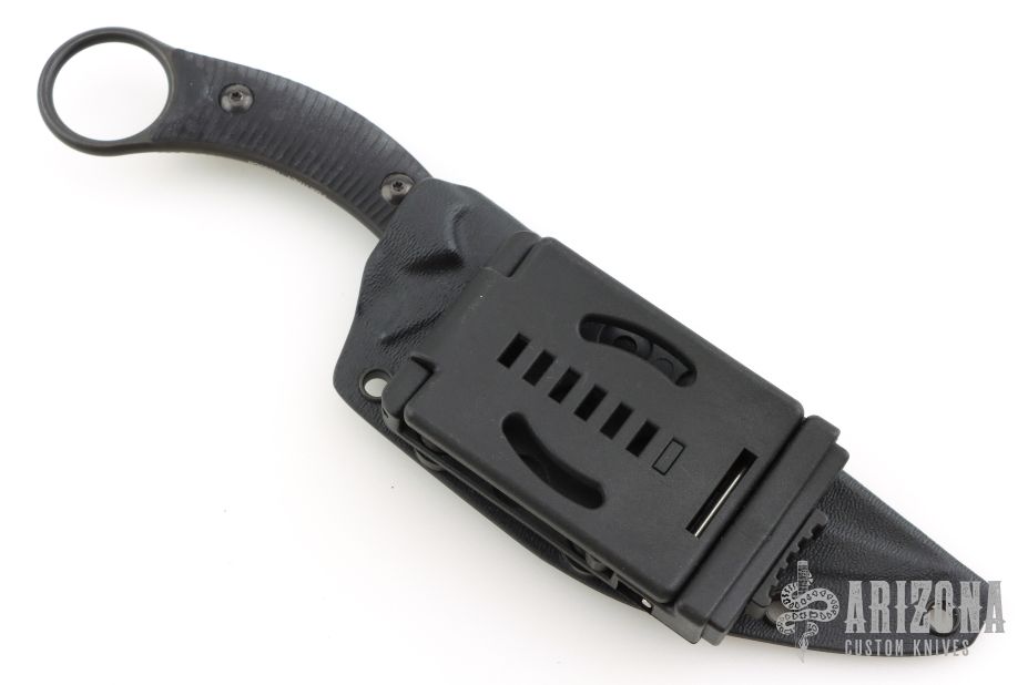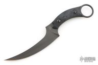 The Bastinelli Mako fixed blade offers a versatile design for tactical and EDC use. It's outfitted with a black G-10 handle and a trailing point blade made from Bohler N690 steel. Has a few light scuffs, otherwise excellent condition. A karambit style finger hole provides a tactical grip with excellent retention. Item includes a molded kydex sheath with a belt clip. Has a few light scuffs, otherwise excellent condition.