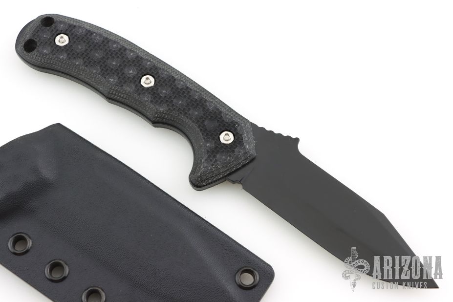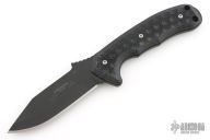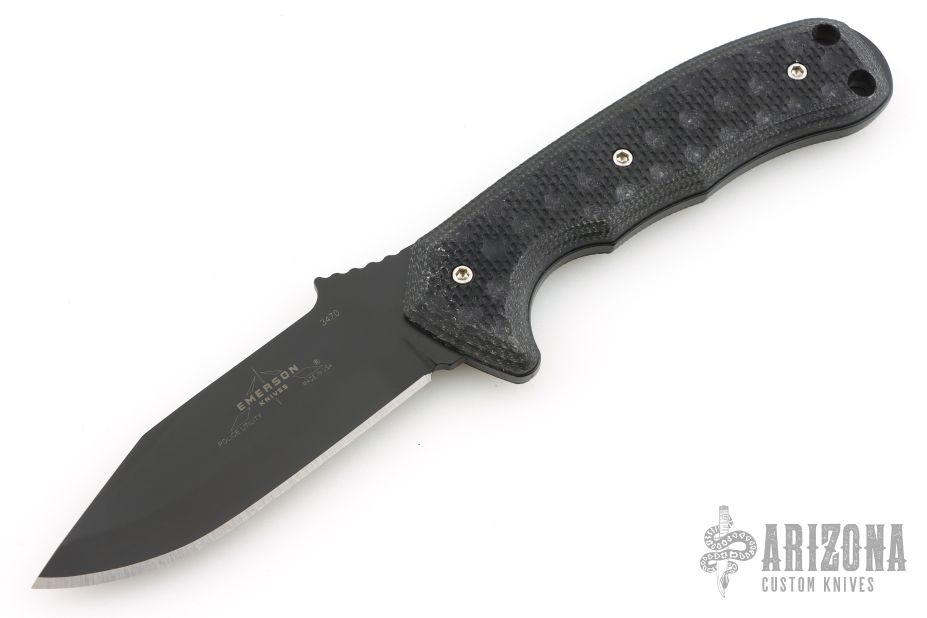 The Emerson Police Utility Knife, otherwise known as “The PUK”, was designed specifically for our boys in blue. This fixed blade model has now features textured black G-10 handles, sandwiched on top of a solid piece of 154 CM Stainless Steel. The 8.5″ Blade features a traditional design and comes with a sheath and belt clip to wear while on duty. Offered to the general public with stone washed or black, and with plain or partially serrated edges. The PUK is good for outdoors use as well as tactical purposes. See why the Emerson PUK is a favorite among Law Enforcement Officers! “The Emerson Police Utility Knife, aka. The PUK, fulfills all of the needs for an Emerson – designed as a fixed blade for police and tactical utility applications. Members of the British SAS have said, “Now this is the knife we've been waiting for.” Due to the design features on this knife -it's perfect for the serious off road trekker, and I mean from Afghanistan to the Belgian Congo. The Police Utility Knife features a short, stout blade with an extremely strong V-Grind and is honed to razor sharpness. The handle features a deep guard and positive thumb ramp designed to provide a “no slip forward” safety grip for the knife.” Comes with original Kydex sheath. Excellent condition.