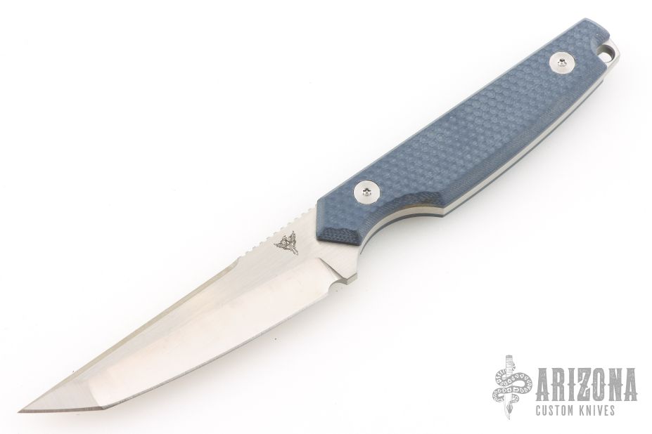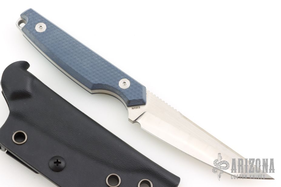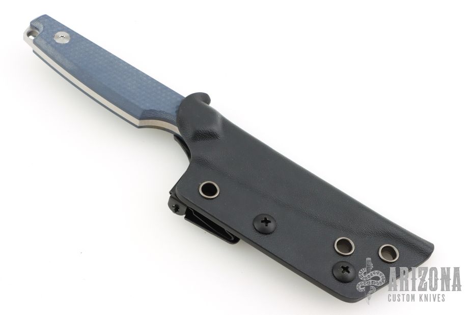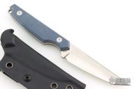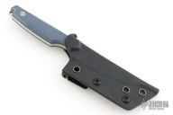 This Kwaiken by Dirty Bird Knives features a satin finished blade with notched thumbrest, .157" blade stock and .875" blade depth, full tang construction. The handle has milled grey G-10 scales. Comes with a kydex sheath. Excellent condition.