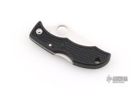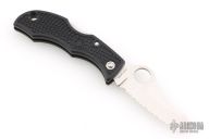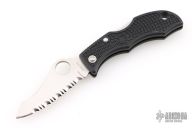 This Jester by Spyderco features a satin finished fully serrated blade with thumbhole and notched thumbrest. The handle has a black FRN frame with stainless steel backspacer. Excellent condition.