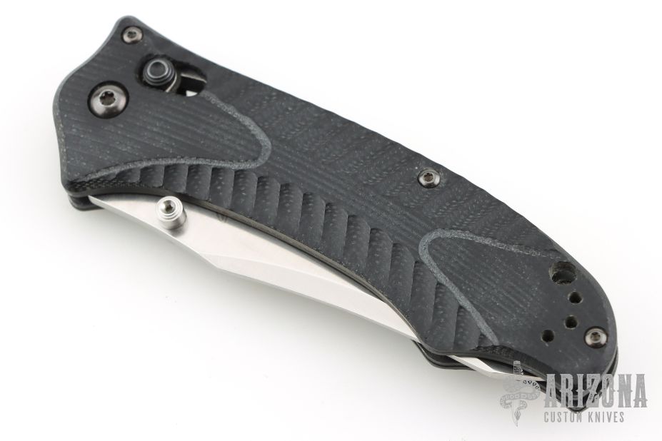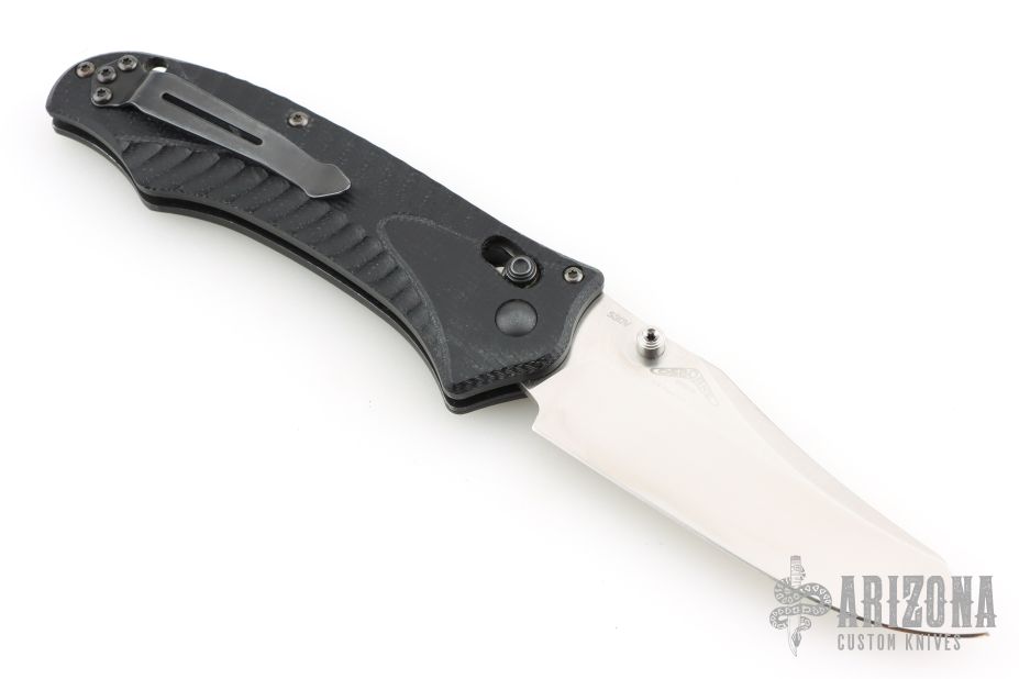 This 950-1 Axis Lock Rift from Benchmade features a clip point satin finish blade with swedge and dual thumb studs. The handle has machined black G10 with black coated stainless steel liners and reversible tip up pocket clip. Includes all original packaging. Excellent condition.