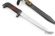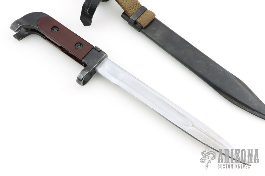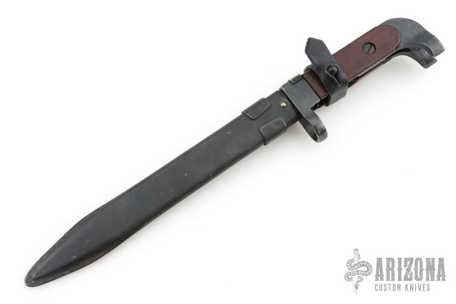 Like all Eastern Bloc bayonets, this Bulgarian bayonet differs little from the USSR pattern on which it was based. The blade is fullered and single edged and has a matte finish. The grips are a reddish brown plastic and are riveted to the blued handle. The scabbard is blued steel. #557 on the butt.