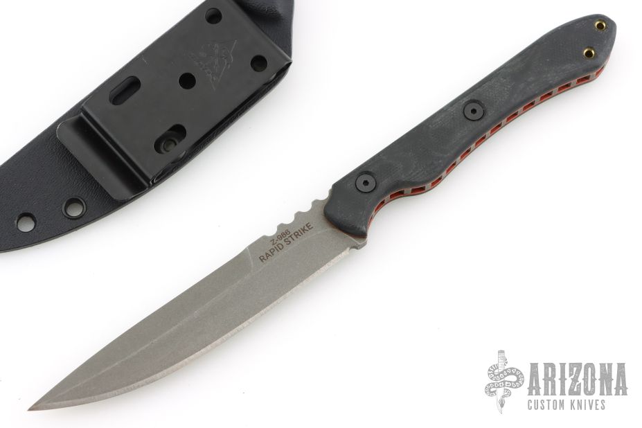 Everything about the Rapid Strike makes it an excellent combative blade. The cutting edge is long enough for good slashing cuts and thrusts. It can be single or double-edged to meet legal requirements or be even more dangerous. The G10 handle is strong and grippy and combined with the recessed jimping that goes all the way around the handle, it’s easy to keep it in your hand when you need it the most. The sheath was designed to allow for a combat grip straight out of the sheath (meaning the hand doesn’t have to be readjusted to grip the handle properly after it’s removed from the sheath). The thin blade material and narrow profile take up little space on a belt, on a vest, in a boot, or wherever else you choose to carry it. 154CM stainless steel was chosen to provide a strong blade with little maintenance needed to keep it clean and sharp.