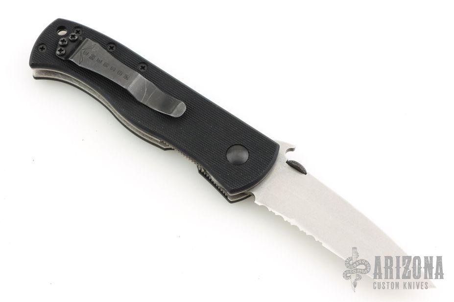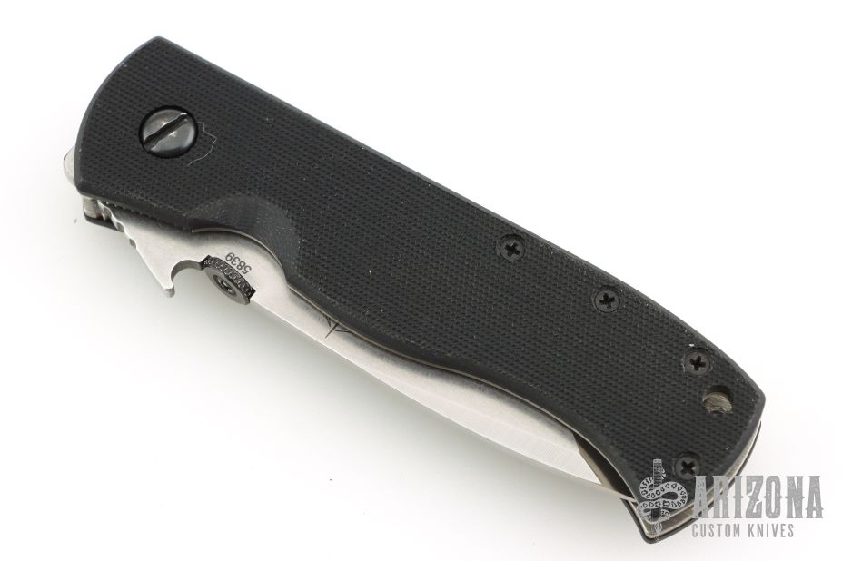 This CQC-7 from Emerson features a stonewashed partially serrated chisel ground tanto blade with notched thumbrest, thumbhole and wave feature. The handle has black G-10 scales, titanium liners, black G-10 backspacer, and a tip up black stainless steel clip. Nice detent, lockup and blade seating. Comes in an Emerson box. Has a couple marks on the clip otherwise excellent condition.