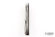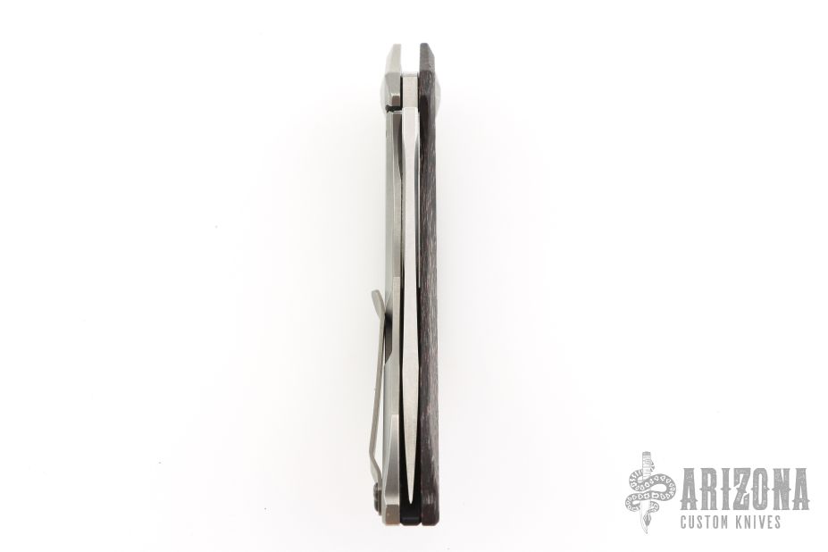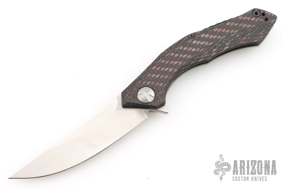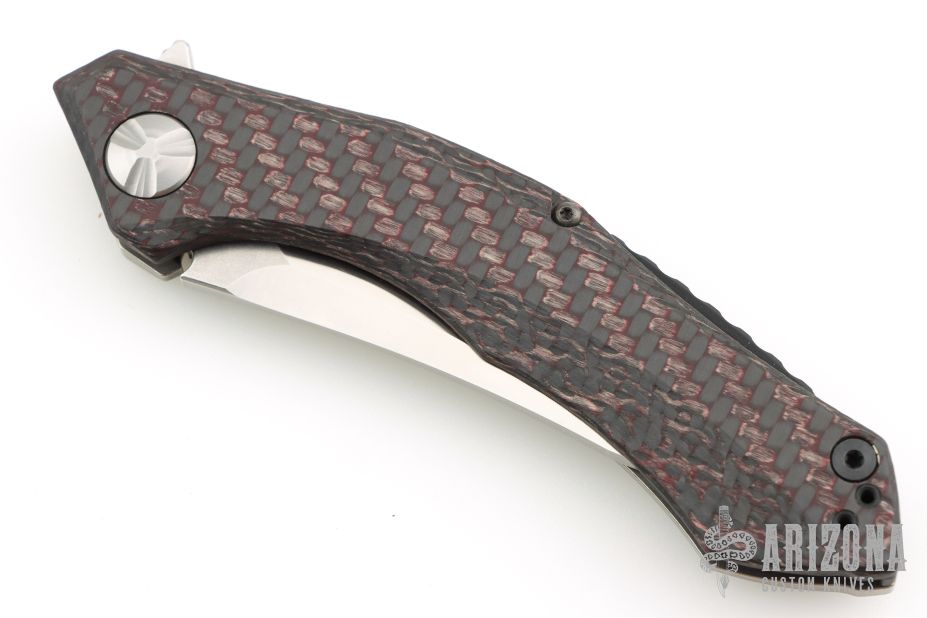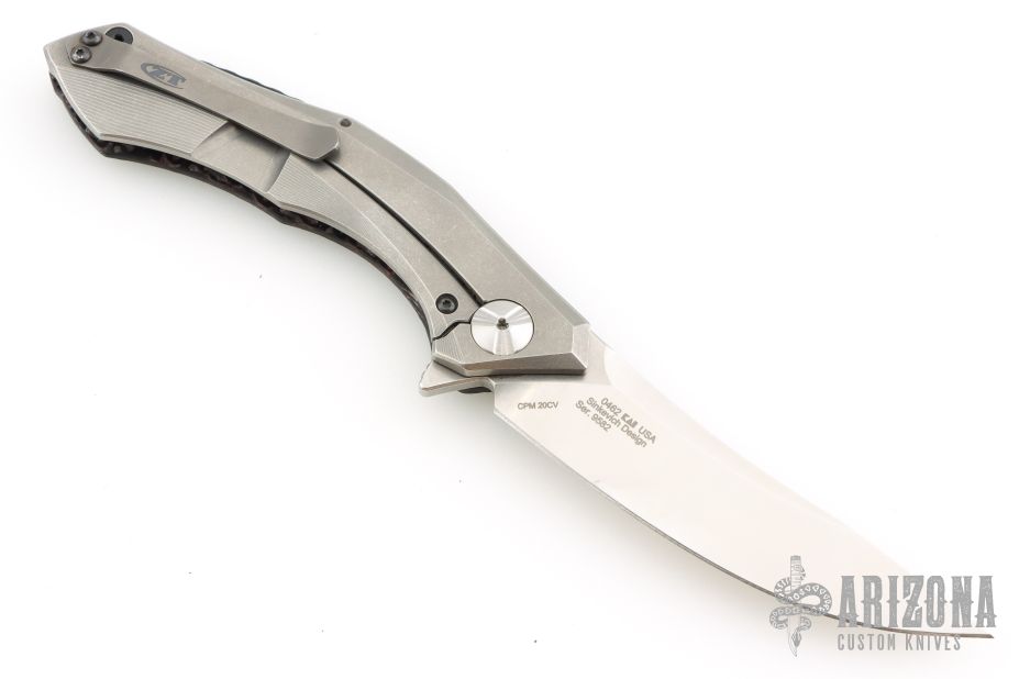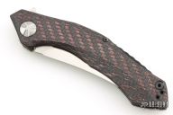 This 0462 Sinkevich Design flipper by Zero Tolerance features a satin finished upswept blade with flipper and swedge. The handle has a red/black carbon fiber and tumbled titanium frame, black aluminum backspacer and a tip up reversible titanium clip. Nice detent, lockup and blade seating, rides on bearings. Has stainless steel lockface insert and overtravel stop, ceramic detent ball. Comes with the original box and papers. S/N 9582. It looks like the scale has had the carbon fiber textured (?) by the previous owner. Has a couple light scuffs, Excellent condition otherwise.