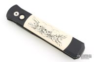 This knife has a dagger style, black finished blade with a false top edge. The handle has a black aluminum frame with ivory micarta inlays and a push button with ivory micarta inlay. Scrimshaw done by Linda Karst. Black stainless steel clip, tip up carry. Limited Edition #208/300. Comes in PT clamshell style black box. There are some light scuffs and scratches on the body of the knife, overall great condition.