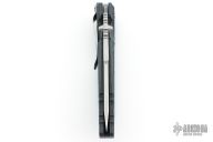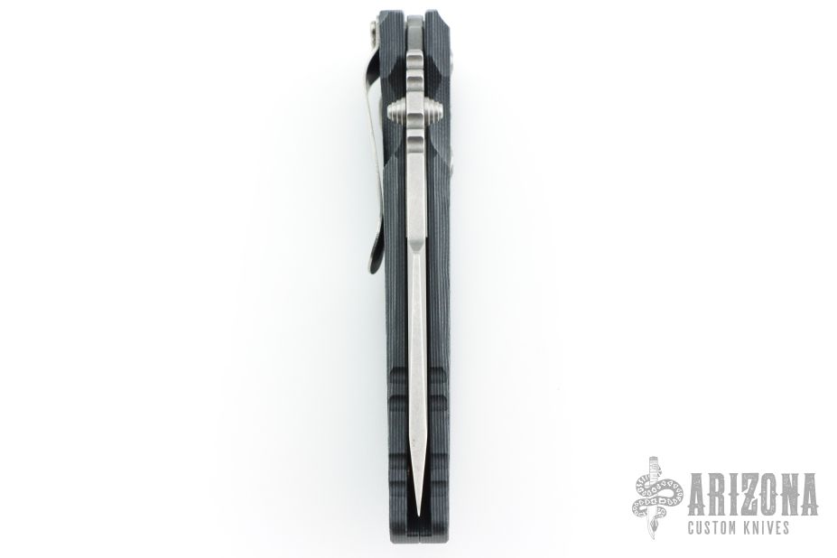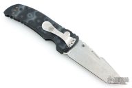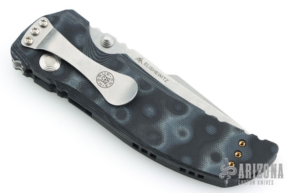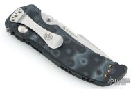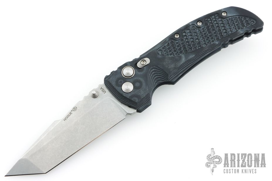 This Hogue/Elishewitz design features a stonewashed tanto blade with dual thumbstuds and notched thumbrest. The handle has milled G-Mascus G10 frame with button lock, safety and tip down carry clip. Excellent condition.