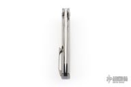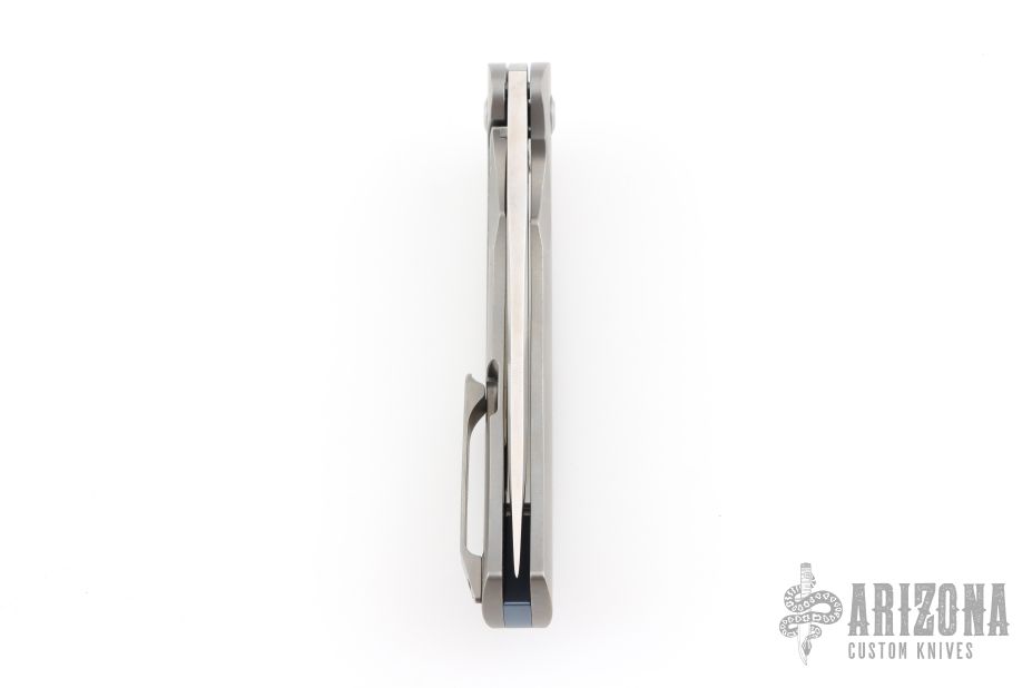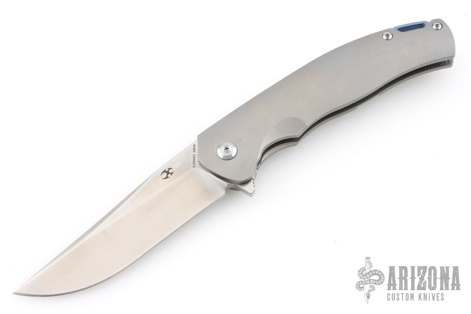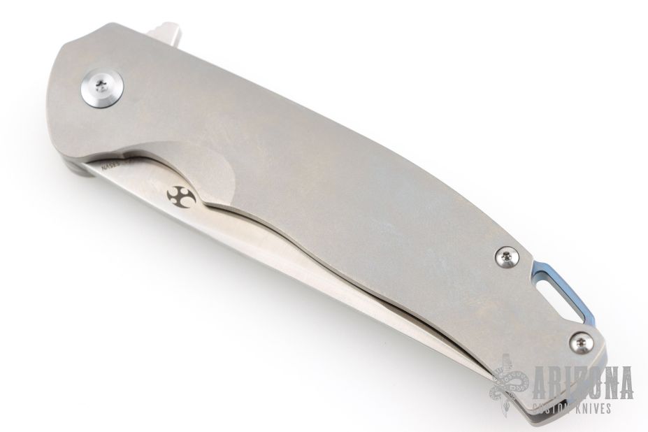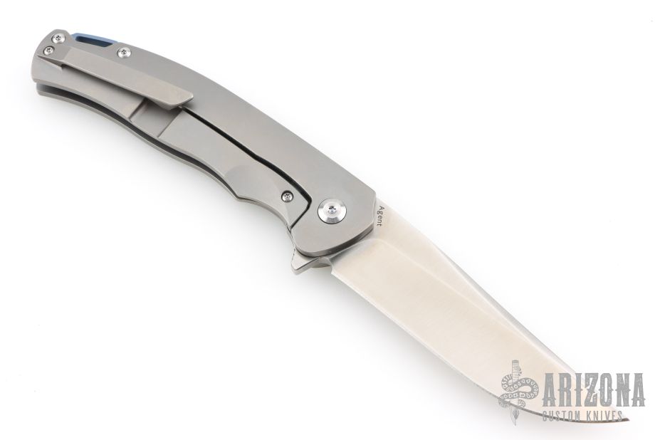 The K1004A2 Agent by Kansept knives features a satin finished blade with flipper. The handle has a bead blasted titanium frame and tip up clip, anodized titanium backspacer with lanyard hole. Rides on bearings, nice detent, lockup and blade seating. Has a couple very light scuffs, otherwise excellent condition.