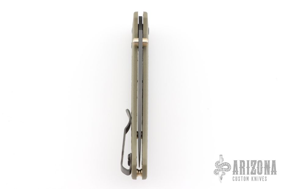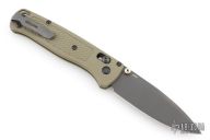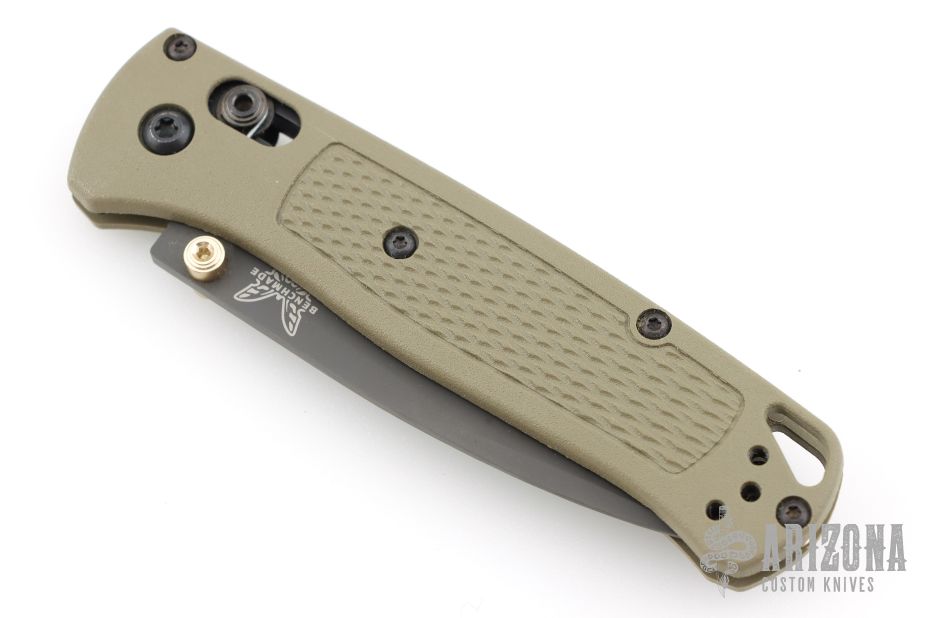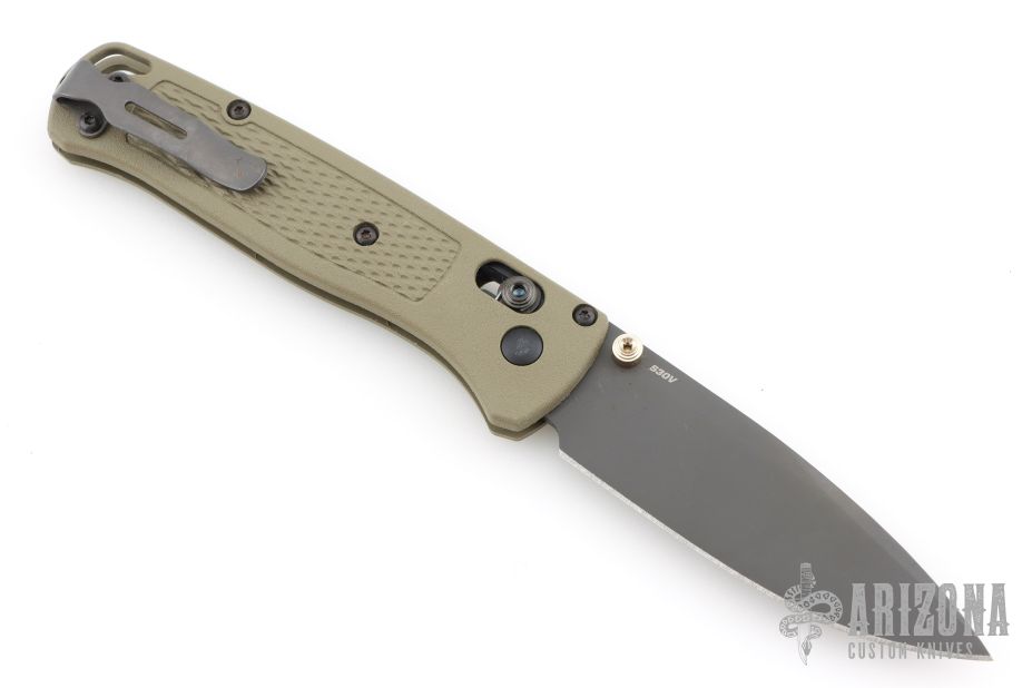 The Benchmade Bugout features a drop point blade with a grey Cerakote finish. It's a manual opener with ambidextrous thumb studs. This AXIS lock has an OD handles with brass spacers and black hardware, a black mini deep-carry pocket clip, and a lanyard hole.  Excellent condition.