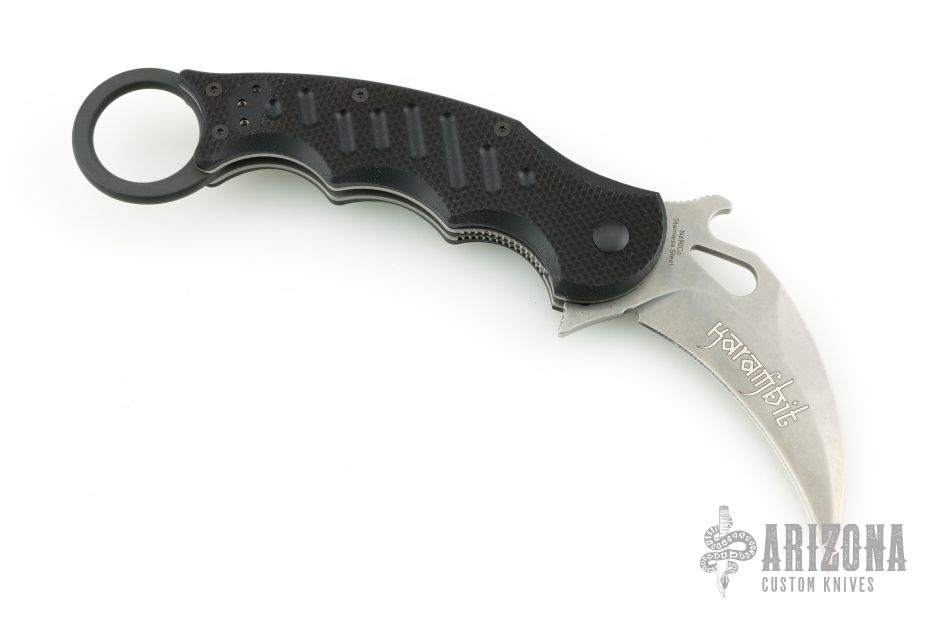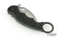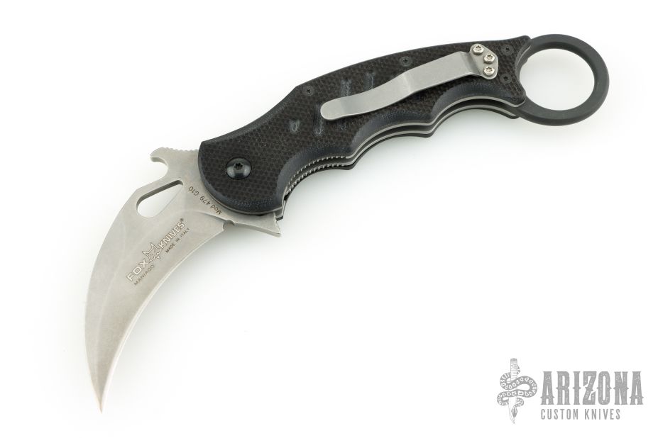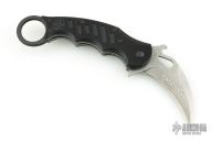 This FX-479 Karambit from Fox Knives Military Division features a stonewashed coated karambit style blade with thumb hole, wave feature and flipper. The handle has a machined black G10 scales over stainless steel liners and backspacer. Black coated 1-inch finger hole in pommel. Excellent condition.