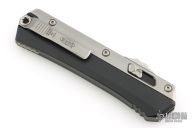 This Glykon by Microtech features a stonewashed double edged blade with fullers and notched thumbrest. The handle has a black aluminum chassis with bead blasted titanium overlays and tip down clip. Comes with original box and papers. Dated 05/2023 and #1119. Has a few light scratches, excellent condition otherwise.