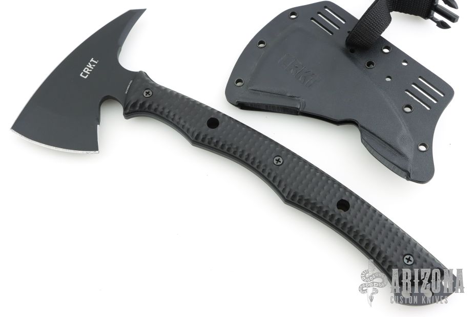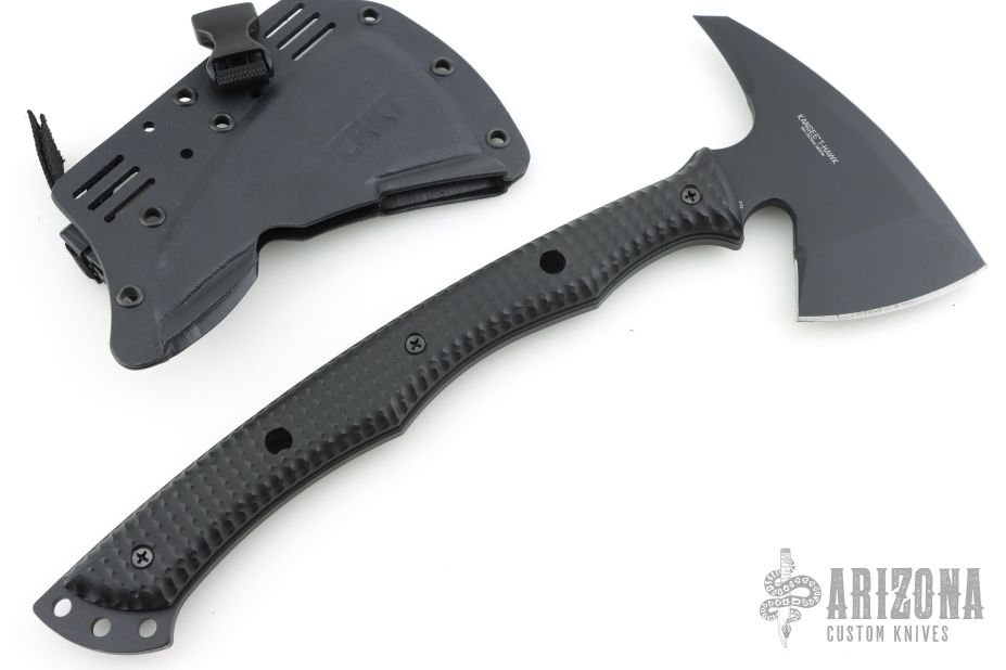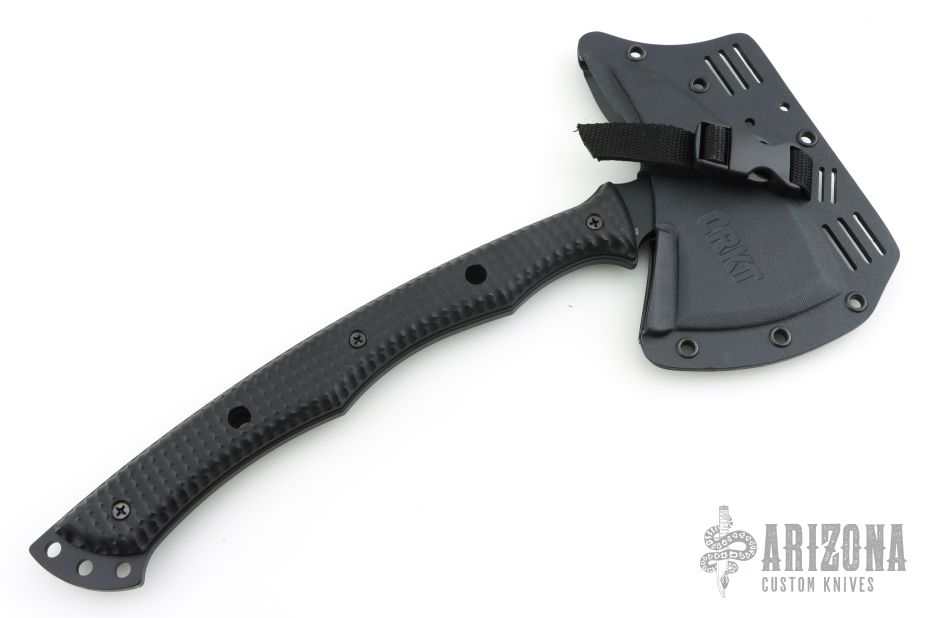 The Kangee T-Hawk features black powder coated SK5 steel construction with an ax front and spike back. Full-tang curved handle and grip grooves along with full-length handle scales that are checkered for added grip security, and can be removed for cleaning. Molle equipped, form-fitting Kydex sheaths slip over the head and secure with a buckled strap.