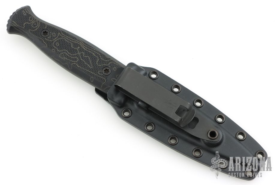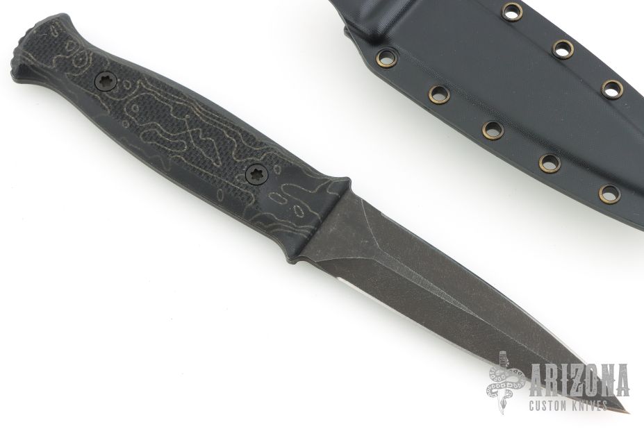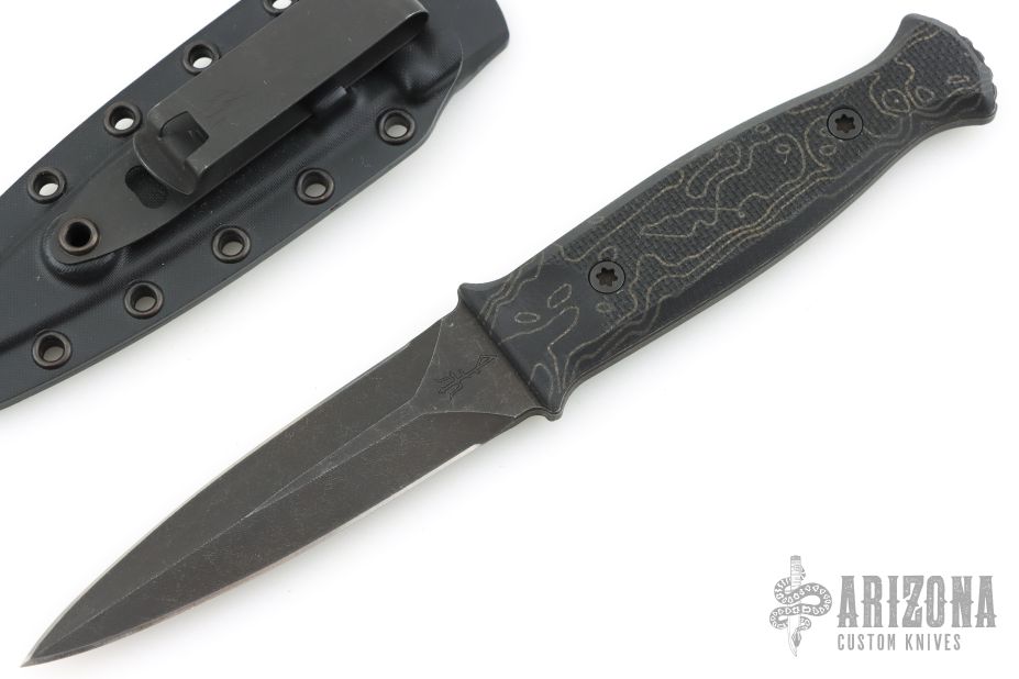 This knife features a black acid tumbled double-edged blade with a full tang construction .147" blade stock and .940" blade depth. The handle has G-10 scales. Comes with a kydex sheath with clip. Excellent Condition.