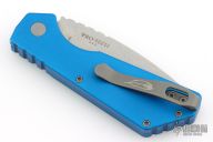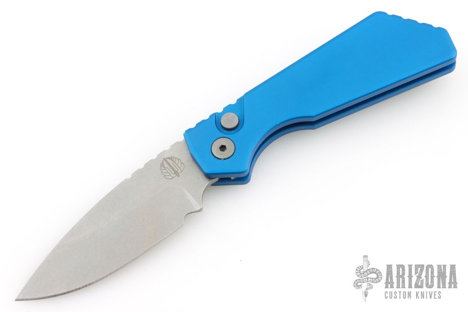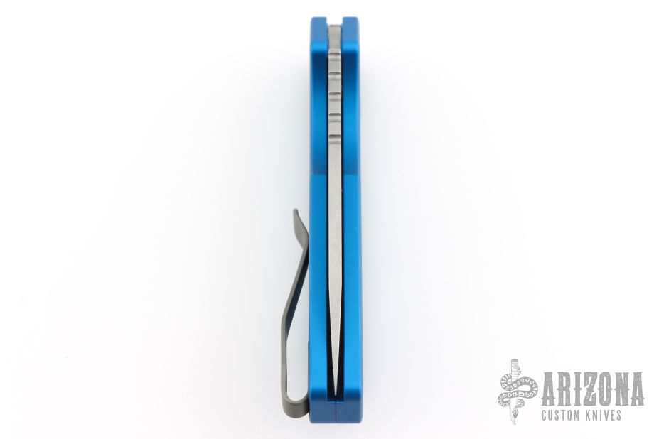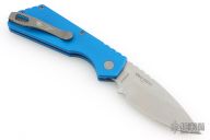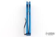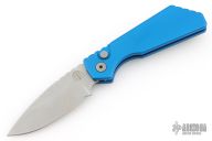 This Pro-Strider PT by Pro-Tech and Strider Knives features a tumbled finished blade with notched thumbrest. The handle has a blue aluminum frame with bead blasted hardware and Lynch NW deep carry tip up clip. Includes the original box, clip, pouch, and papers. has some light scuffs and scratches, great condition otherwise.