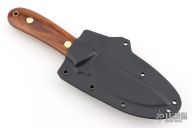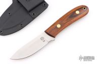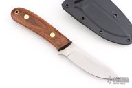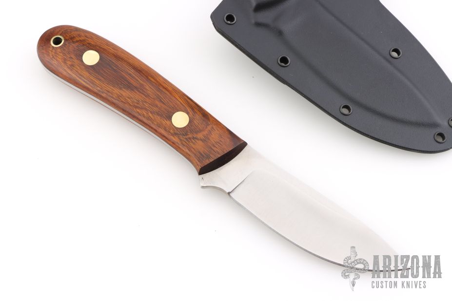This K-5 King's River Skinner by Dozier Knives features a satin finished blade with .130" blade stock and 1.059" blade depth, full tang construction. The handle has desert ironwood scales with brass pins and lanyard hole. Comes with kydex sheath with belt clip. New from maker.
