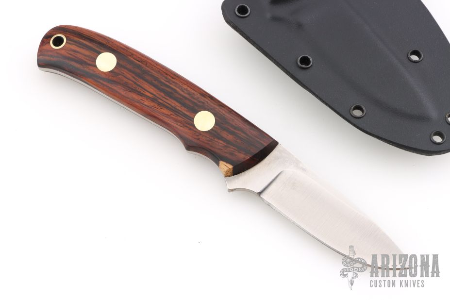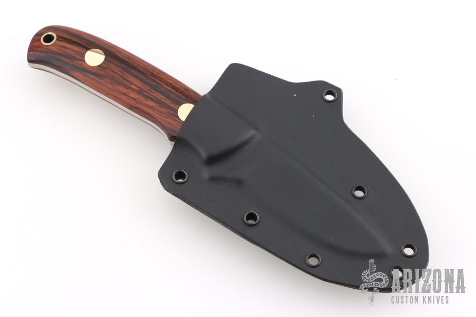This K-14 by Dozier knives has a satin finished drop point blade with full tang construction, .126" blade depth and .834" blade stock. Has cocobolo scales with brass pins and lanyard hole. Comes with a kydex sheath. New from maker.