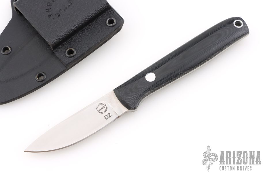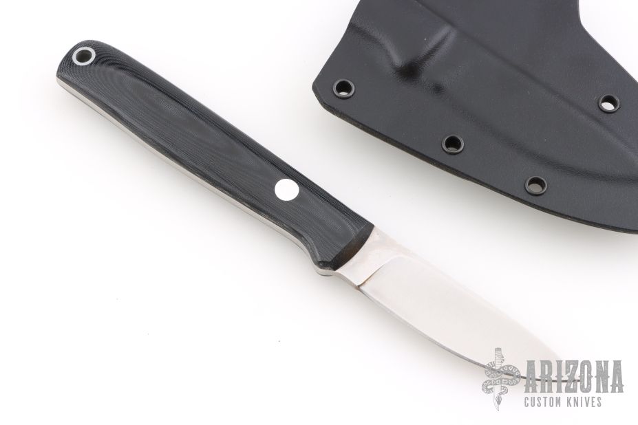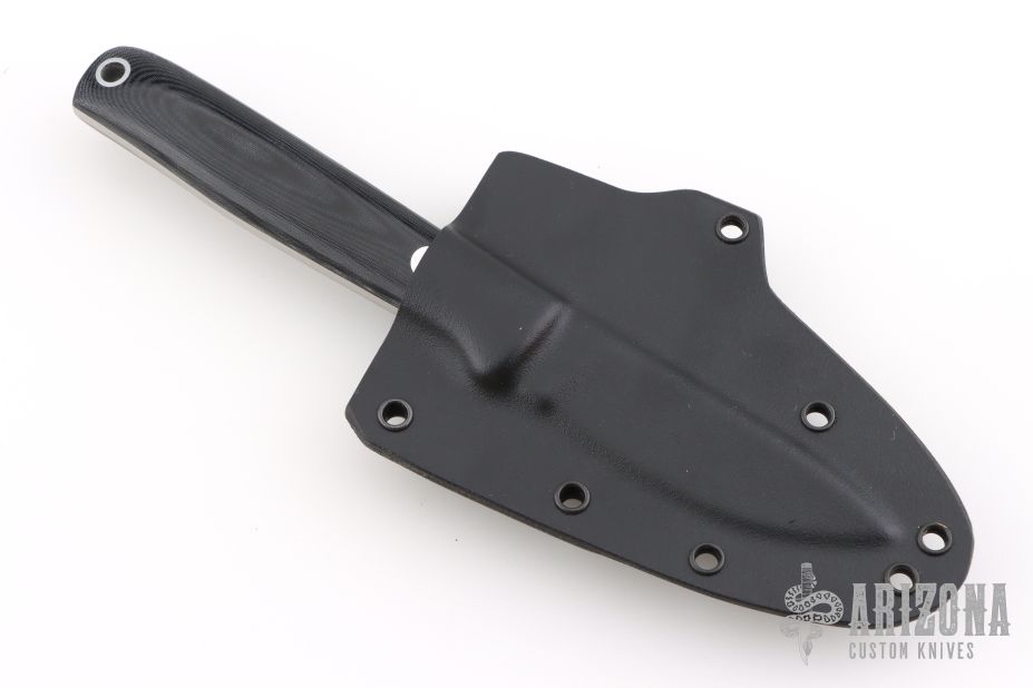 This K-46 by Dozier Knives features a satin finished blade with .123" blade stock and .708" blade depth. The handle has black linen micarta scales with a aluminum pin and lanyard tube over full tang construction. Includes kydex sheath. New from maker!