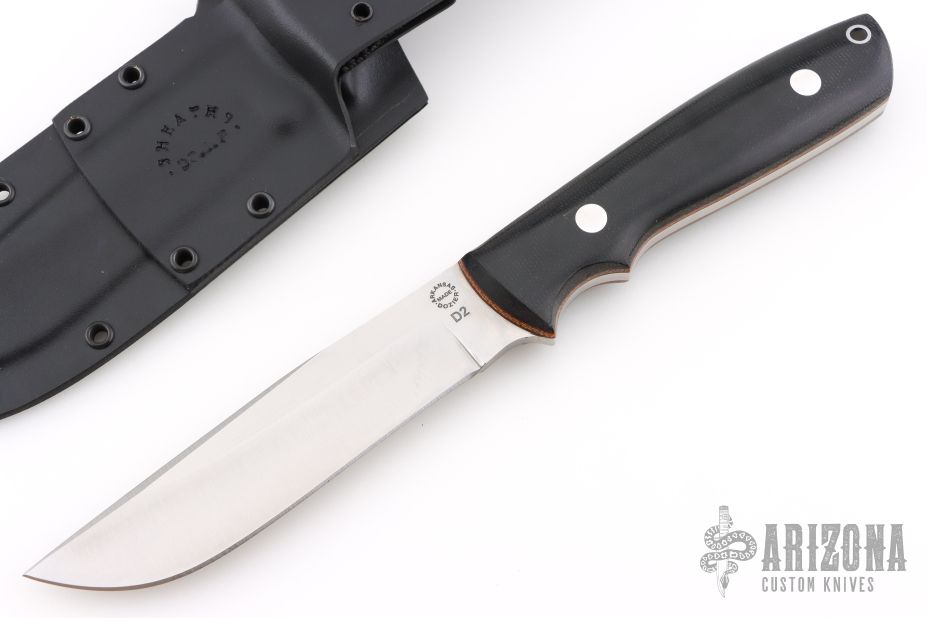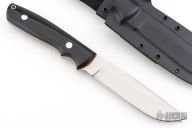 This KS-7 Wilderness by Dozier Knives has a satin finished blade with full tang construction, .173" blade stock, 1.117" depth, full tang construction. Handle has black canvas micarta scales with natural canvas micarta liners, aluminum pins and lanyard tube pin. Comes with kydex sheath. New from maker!