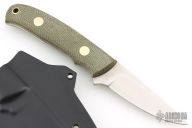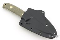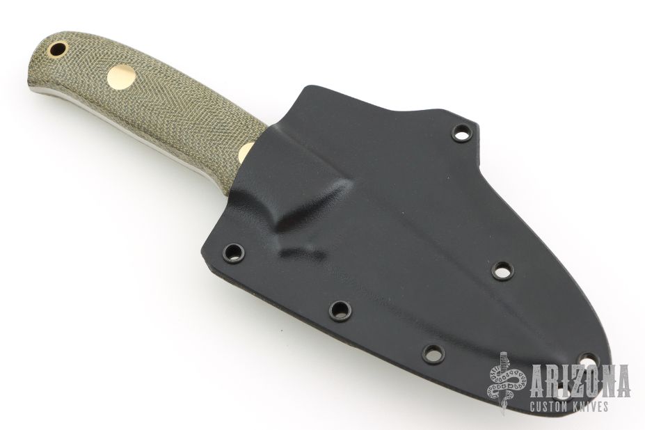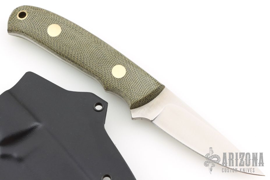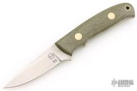 This K-33 Bird and Trout by Dozier Knives features a satin finished blade with .123" blade stock and .844" blade depth, full tang construction. The handle has green canvas micarta scales with brass pins and lanyard hole. Comes with kydex sheath. New from maker.