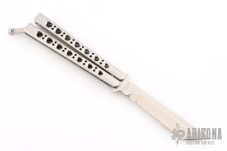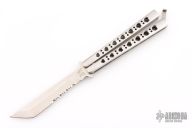 The model 44S by Benchmade is rare and hard to find. Tanto style partially serrated blade with a satin finish. Stainless steel skeletonized handles with T latch. Comes with original sheath, box and papers. Excellent condition.