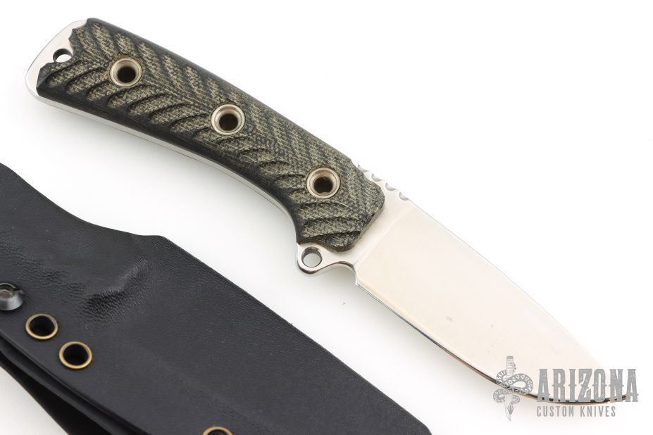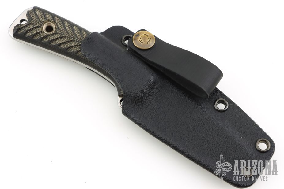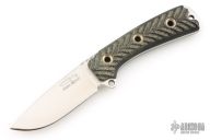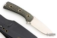 This SAR 3 SE by the Busse Combat Knife company features a satin finished blade with notched thumbrest, .155" blade stock, 1.094" blade depth. Full tang construction with textured black canvas micarta scales. Comes with a kydex sheath with belt loop. Has scratches, otherwise good condition.