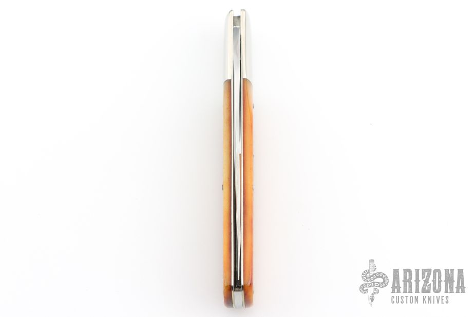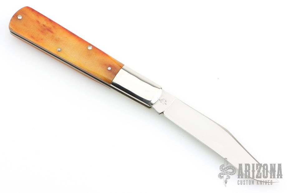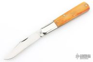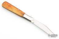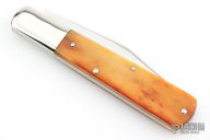 This slipjoint by Queen Cutlery features a satin finished blade with nail nick. The handle has nickel silver bolsters, front and rear, sawcut bone covers, brass liners and a stainless steel spring. Has some light scratches, otherwise excellent condition.