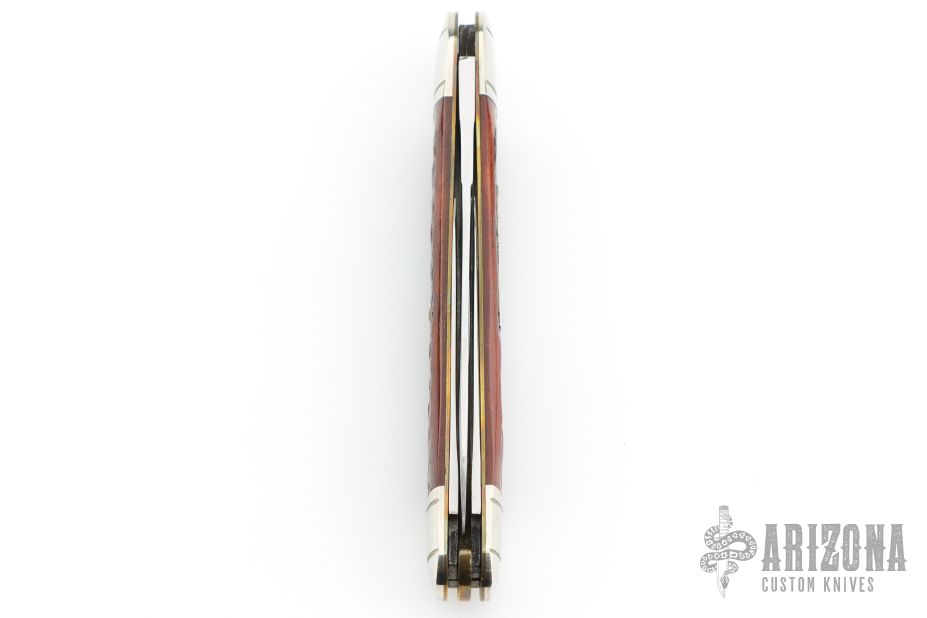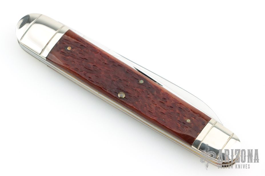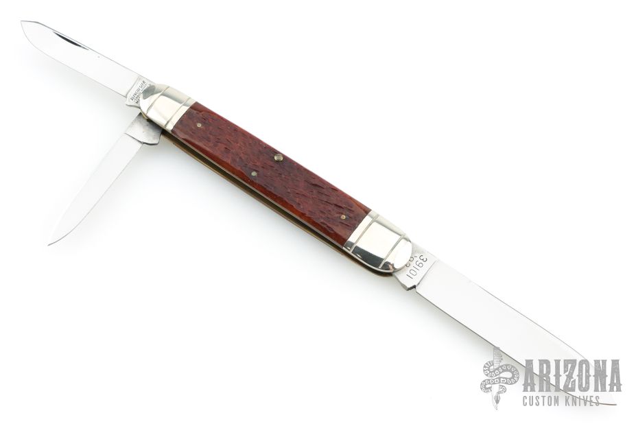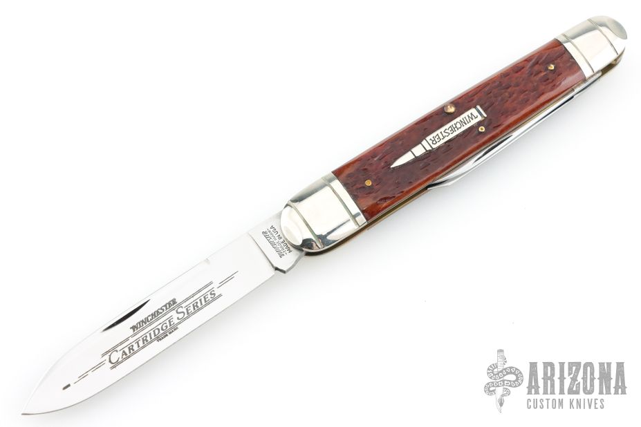 This Winchester folder features three mirror polished blades. Nickel Silver front and rear bolsters with jigged bone covers. Brass liners and steel spring. Has some light scratches, excellent condition.