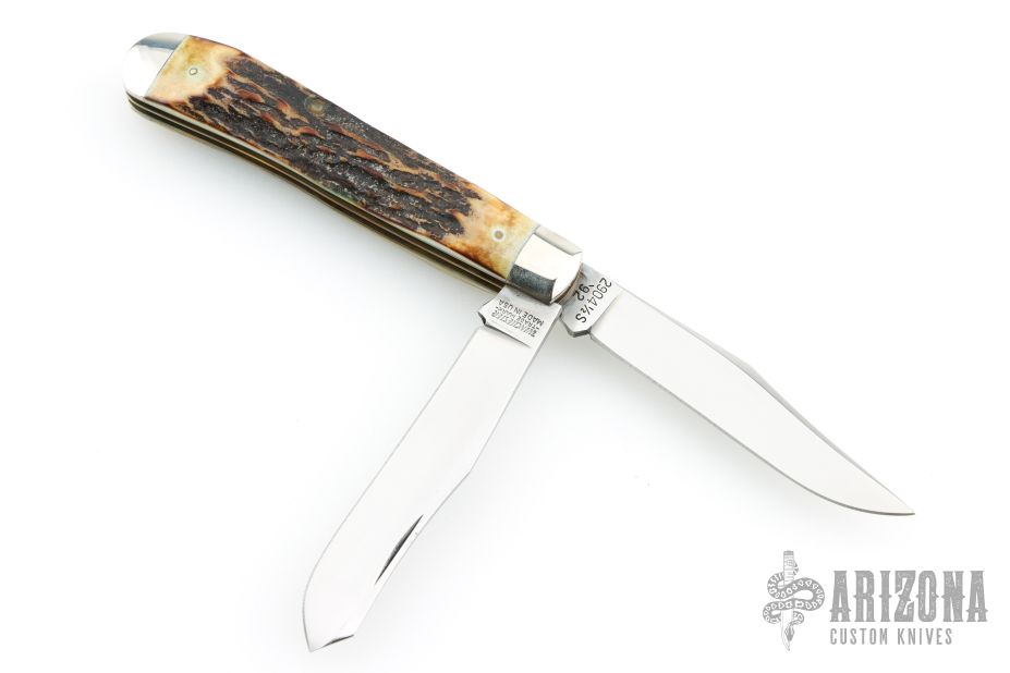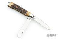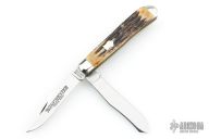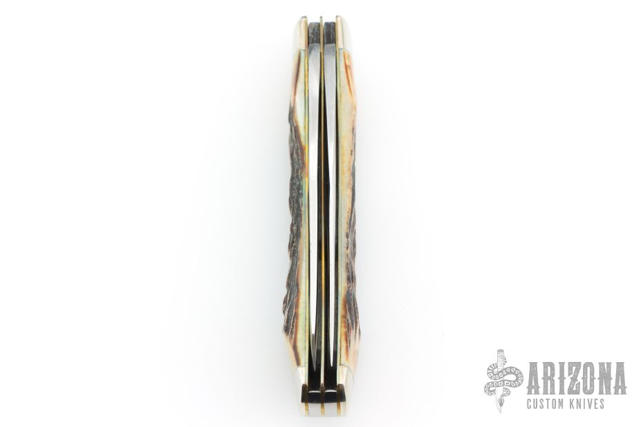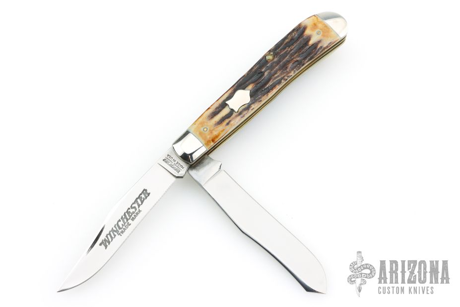 This Winchester folder features two mirror polished blades. Nickel Silver front and rear bolsters with stag covers. Brass liners and steel springs. Has a couple light scratches, otherwise Excellent Condition.
