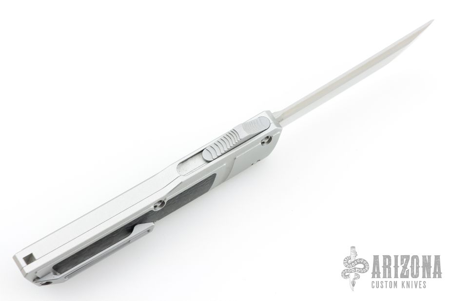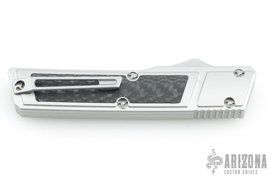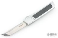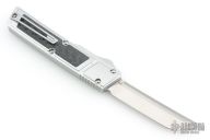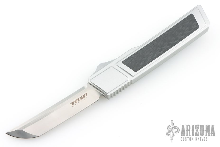 This Ripper OTF Auto by No Limit Knives features a satin finished Tanto blade. The handle has a silver aluminum frame with carbon fiber inlays, tip up anodized titanium clip. Excellent condition.