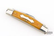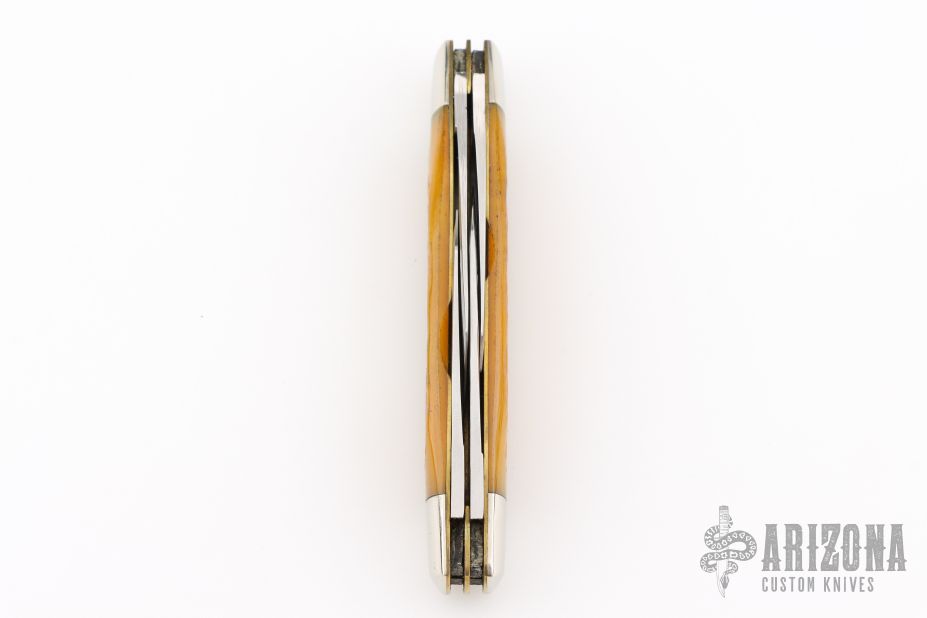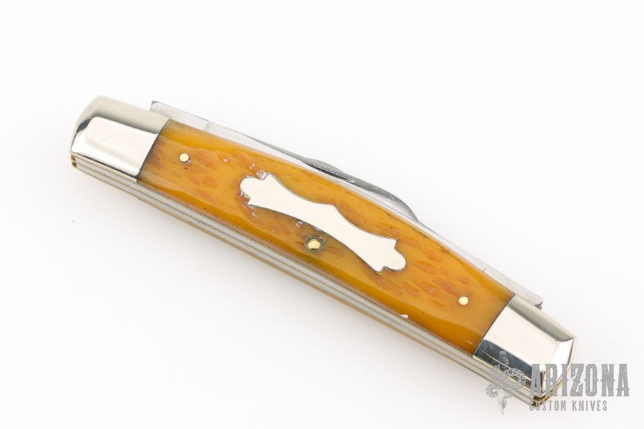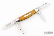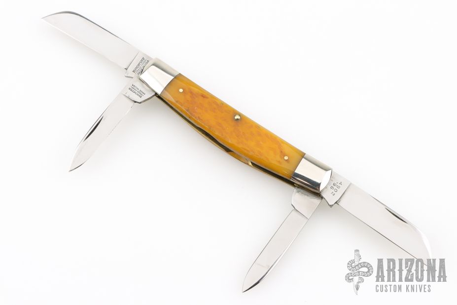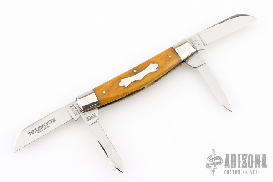 This Winchester folder features four mirror polished blades. Nickel Silver front and rear bolsters with light brown/yellow jigged bone covers. Brass liners and steel spring. Winchester box. Has some light scratches, Excellent condition.