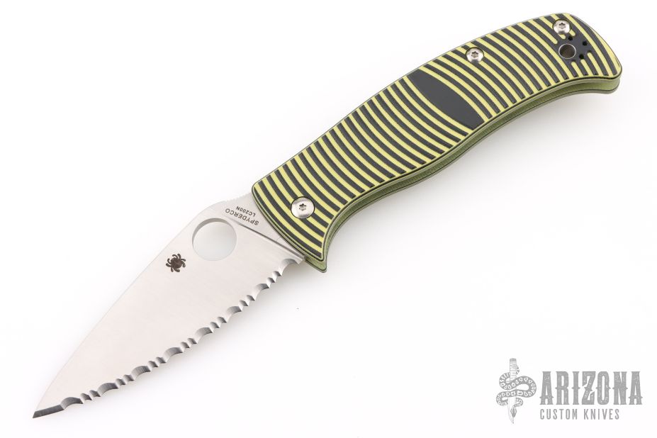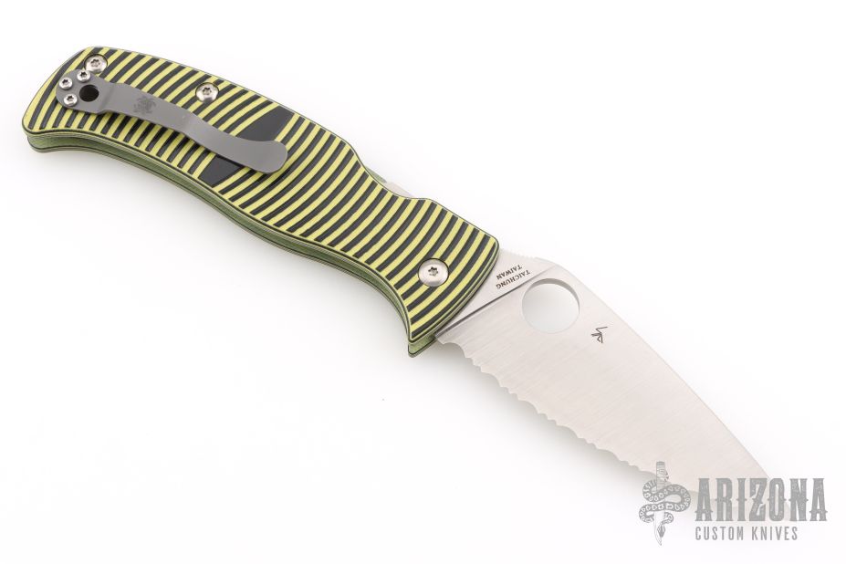 This Caribbean Pin by Spyderco features a satin finished fully serrated blade with thumbhole and a notched thumbrest, has LC200N blade steel. the handle has milled black/yellow G-10 scales, stainless steel liners, tip up bead blasted stainless steel clip, left/right reversible. Lanyard hole. Comes with original box and papers. Excellent condition.