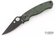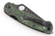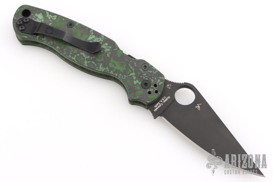 This Paramilitary 2 Linerlock Folder from Spyderco has a black finished clip point blade with thumb hole and notched thumb rest. Handle has black/green Fat Carbon scales with stainless steel liners and stainless steel 4-way reversible clip. Comes with original box and papers. Excellent condition.