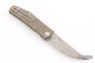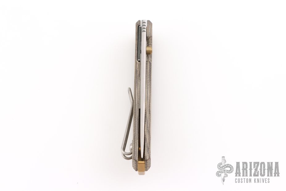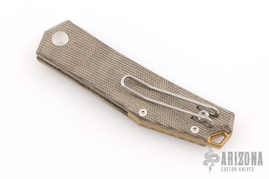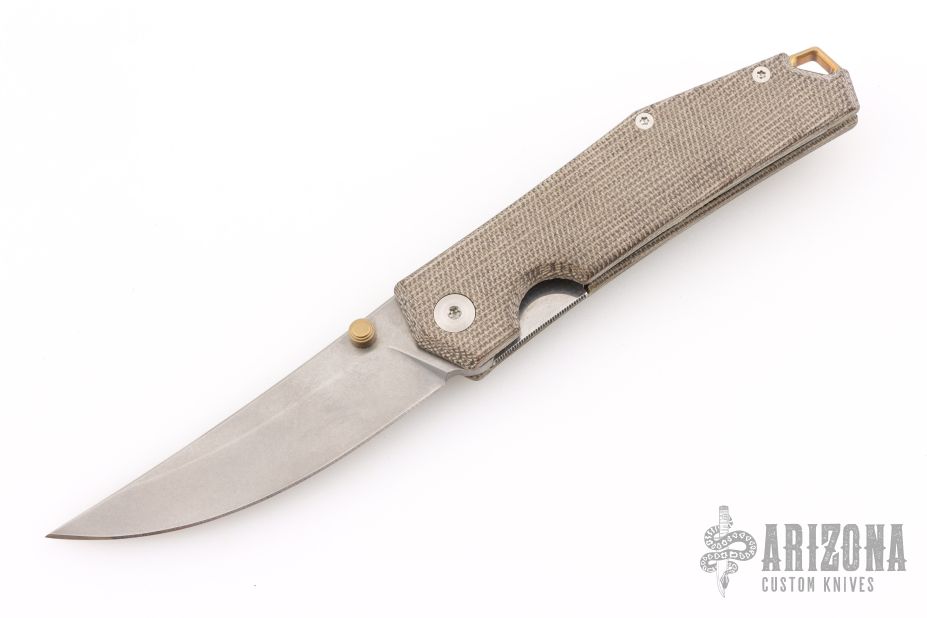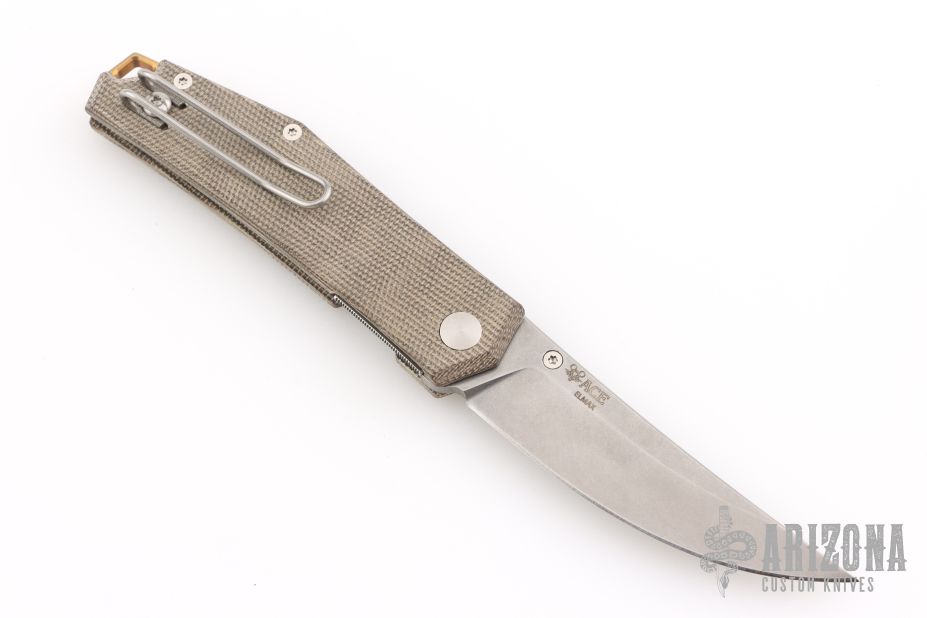 This ACE Clyde by Giant Mouse Knives features a stonewashed upswept blade with a brass thumbstud and backspacer. The handle features natural canvas micarta scales. Excellent Condition. Comes with original box and papers.
