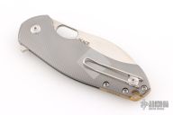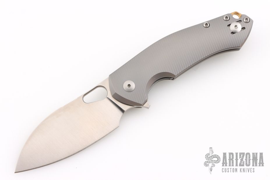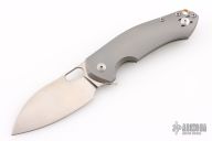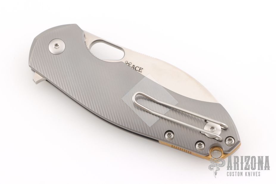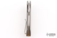• Handle: Gray titanium handle scales on steel liners with a brass backspacer.