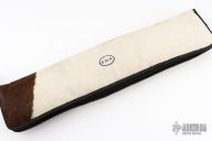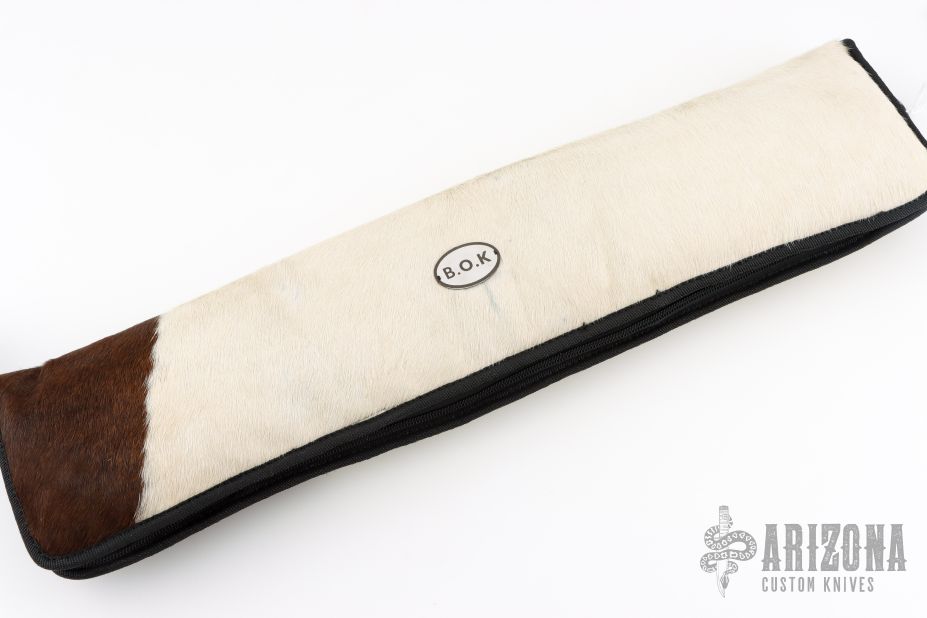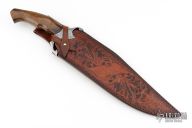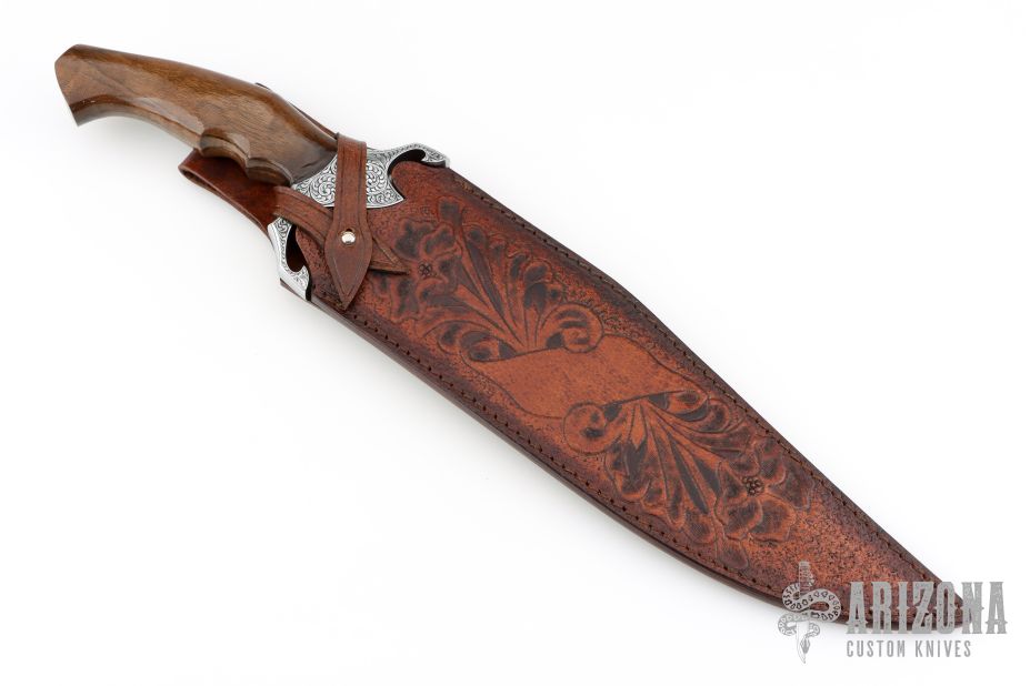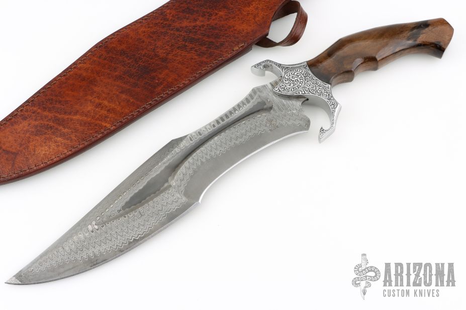 The Beast by Black Ore Knives features a San Mai Ladder Damascus blade with false top edge and fullers, .212" blade stock and 2.580" blade depth, hidden tang construction. The handle has an engraved stainless steel guard with a walnut wood grip. Comes with a hand tooled brown leather sheath. New from maker. Comes with a zippered case.