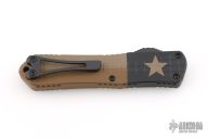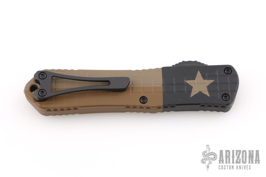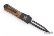 This Manticore-E by Heretic Knives features a two-tone black double edged blade. The handle has a Texas themed aluminum frame with black stainless steel hardware and tip down clip. Comes with original box, lube and papers. Excellent Condition.