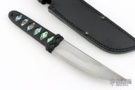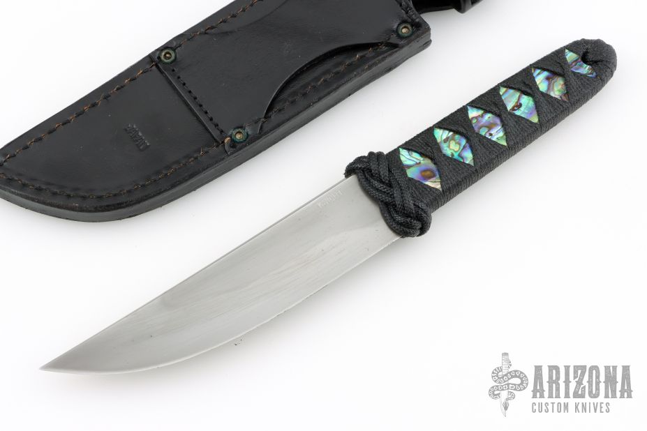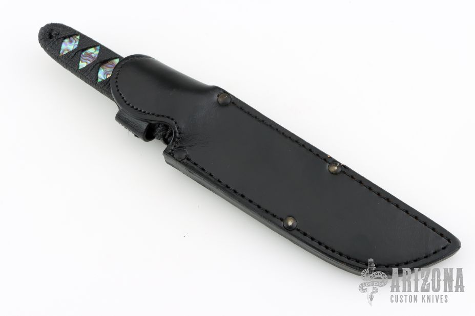 This Tanto by Master Smith Jason Knight features a hand rub satin finished blade with hamon, .191" blade stock and 1.237" blade depth, hidden tang construction. The handle has black epoxied cord over abalone. Has some light spotting on the blade, otherwise excellent condition. Comes with a black leather Cold Steel sheath that fits nicely.