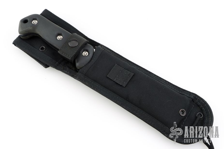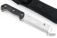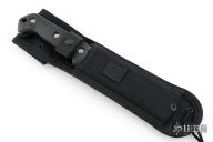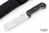 This Tactool from Becker Knife & Tool (pre-Camillus) features a mirror polished chisel ground partially serrated blade with gut hook, .254" blade stock and 1.600" blade depth, full tang construction. The handle is comprised of black scales with lanyard hole in pommel. Comes with a nylon sheath. Has light scratches, good condition otherwise.