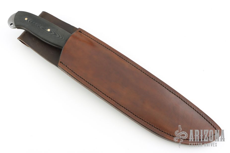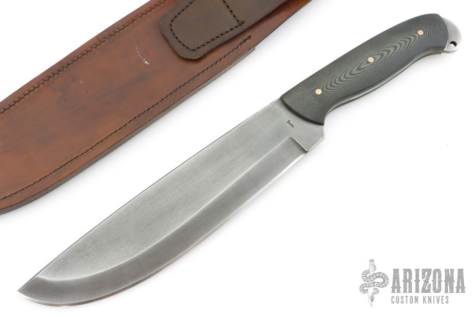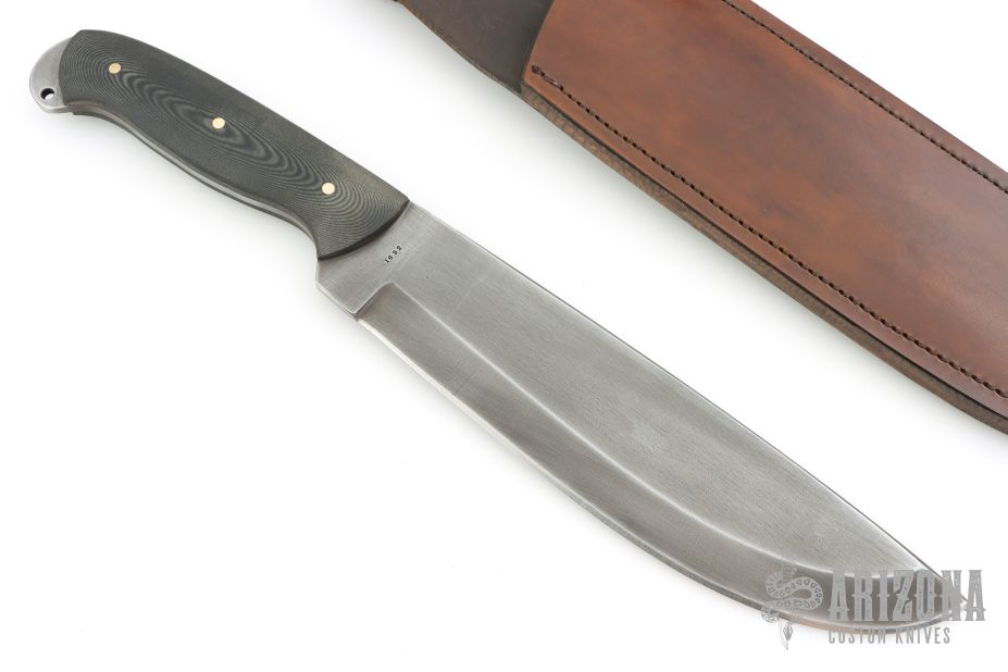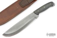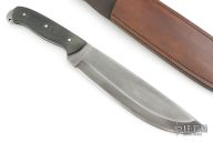This Camp Knife by Ricky Fowler features a darkened blade with notched thumbrest, .190" blade stock and 2.369" blade depth, full tang construction. The handle has black linen micarta scales with brass pins and a lanyard hole at the pommel. Comes with a brown leather belt loop. Excellent condition. #1692 on the ricasso. Comes with a zippered case.