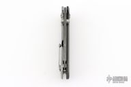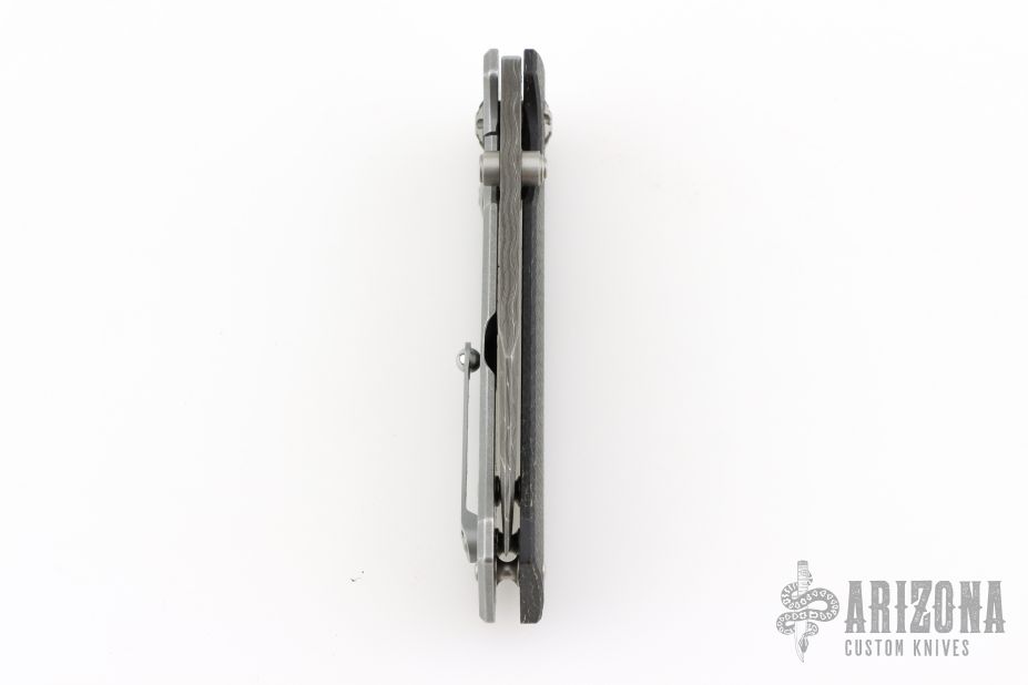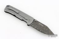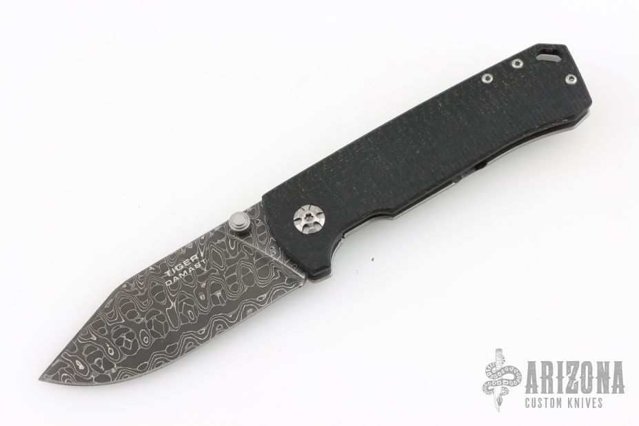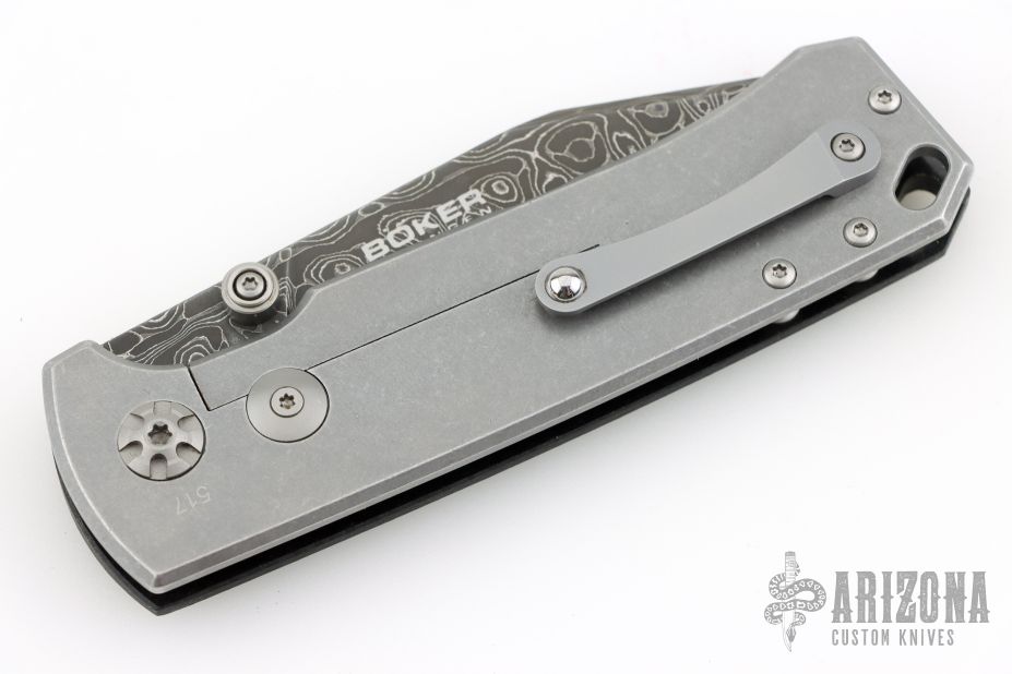 This knife by Boker features a Damascus blade with dual thumbstuds. The handle handle has a burlap micarta and stonewashed stainless steel frame. Tip up stainless steel pocket clip. Includes original box and papers. Excellent condition.