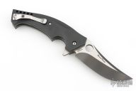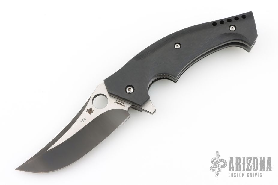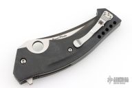This Mamba flipper is a Walter Brend and Joel Pirela design executed by Spyderco. It features a two tone blade with satin finish flats and black grinds. Notches on blade spine and spine of handle. Carbon Fiber scales, bead blasted titanium liners, black G-10 backspacer, and a tip up stainless steel clip. Smooth function with a nice lock, detent and blade seating dead center. Hidden lanyard pin at the butt. Comes with original zippered Spyderco case and papers. Excellent condition.