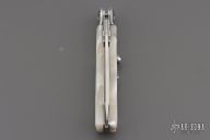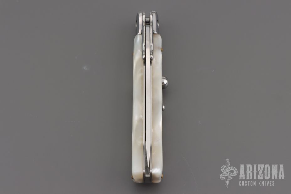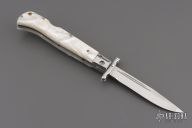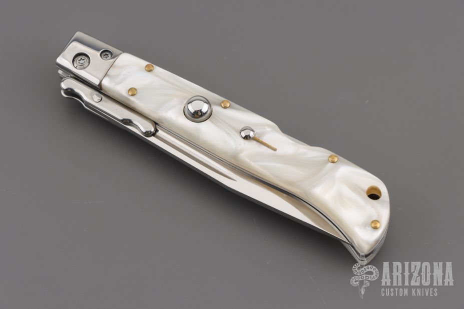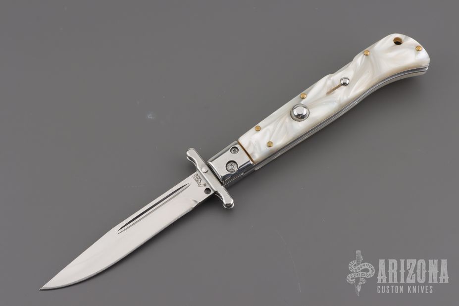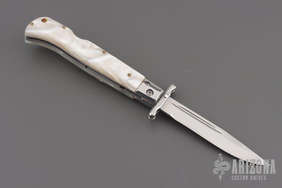 This Swing Guard Lockback Auto by AKC Italy has a polished stainless steel blade with fullers. The handle has pearlex scales with stainless steel bolsters, stainless steel liners, and stainless steel back spacer and lock. Has a couple light scuffs, otherwise Excellent Condition.