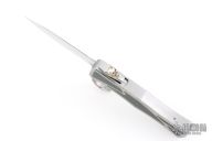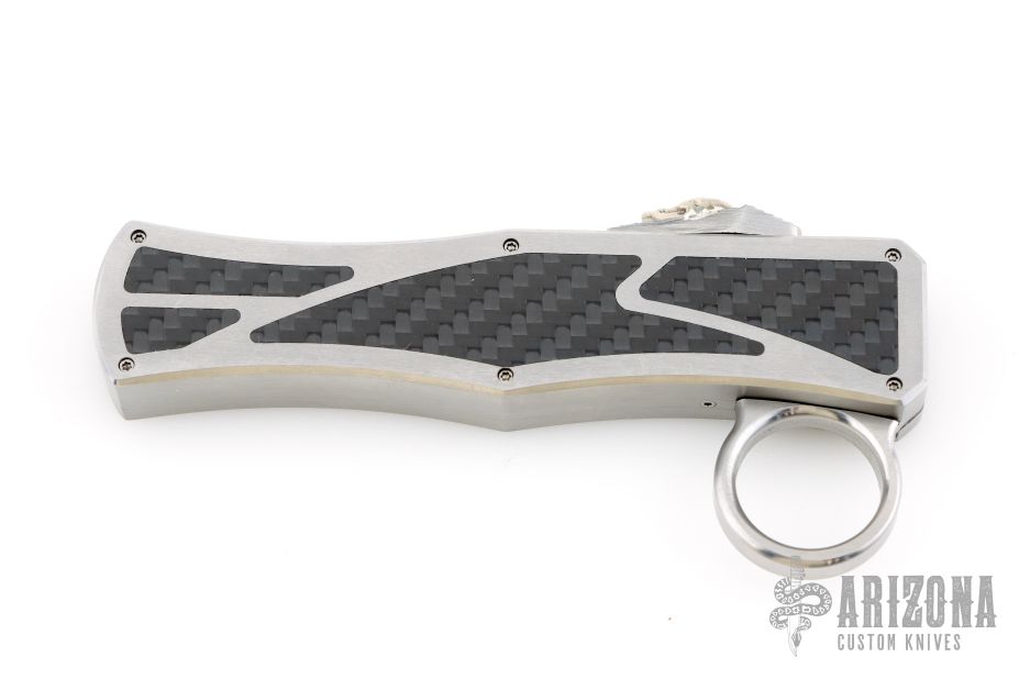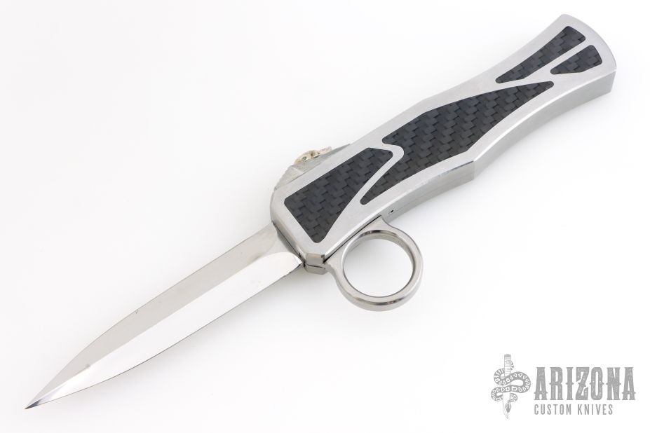 This Burn Tomb Raider OTF has a hollow ground double edged mirror polished blade. Chassis is cut from 416 Stainless Steel and has 3K twill carbon fiber inlays. Comes with COA dated 5-12-25. Excellent condition.