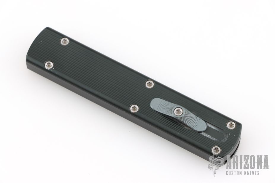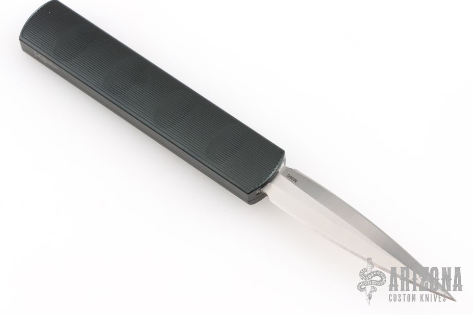 This Zulu Spear by Darriel Caston features a double edged satin finished blade. The handle has an aluminum frame with satin hardware and gray button. Excellent condition.