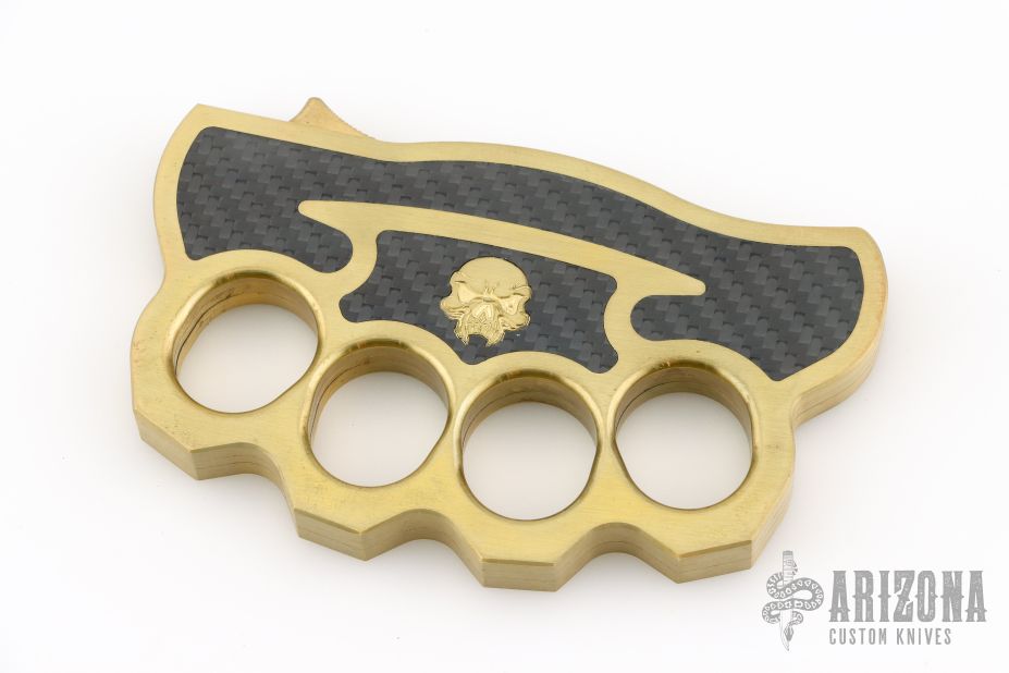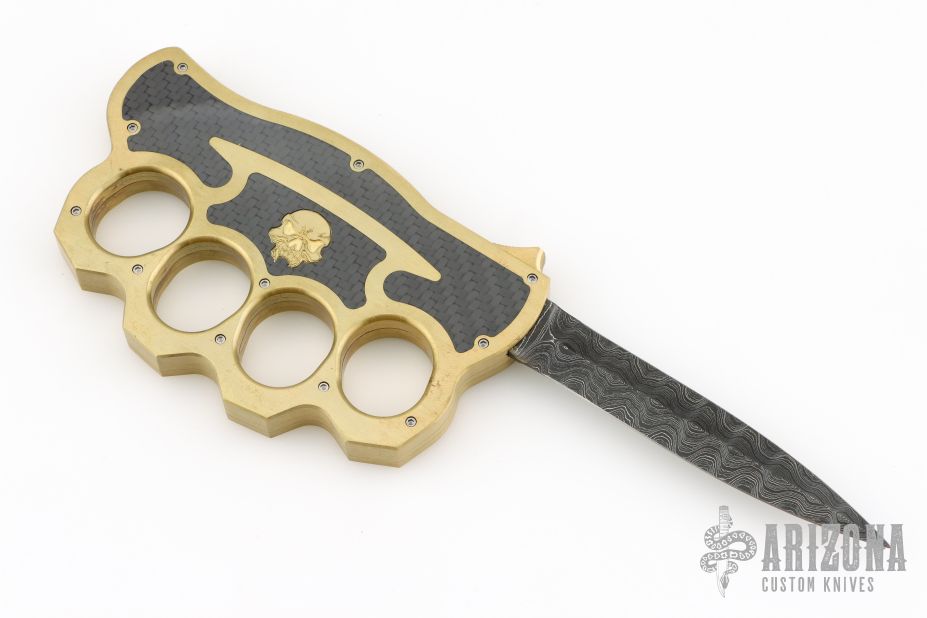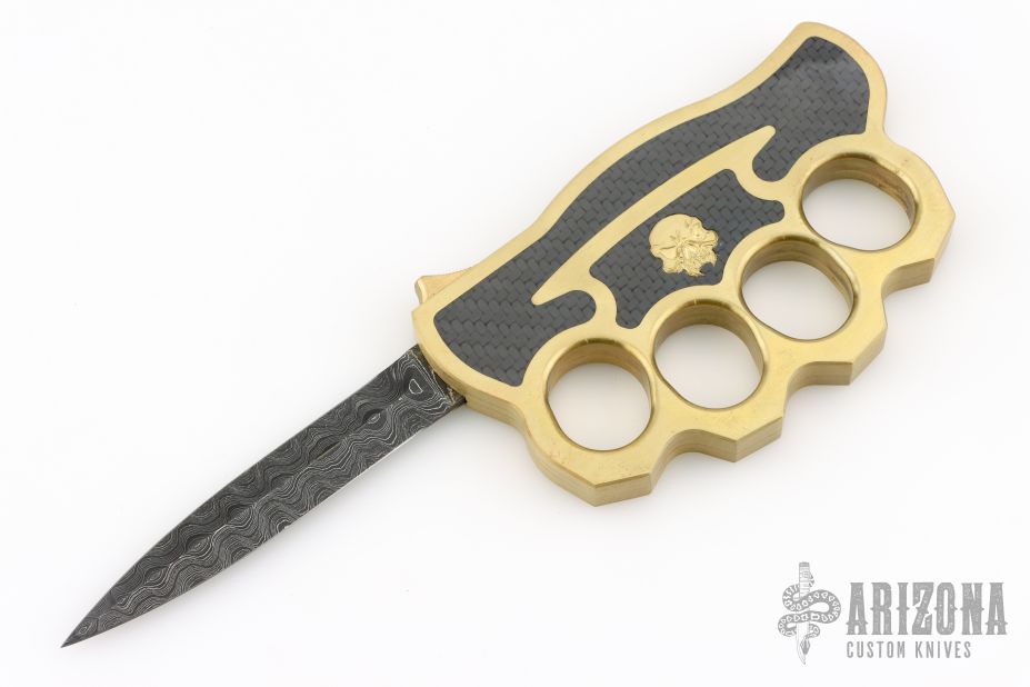 This Custom K-Razor by Burn Knives features a Damascus double-edged blade. The handle has a 360 Brass knuckle frame with 3K carbon fiber inlays. Comes with a COA dated 4-11-25. Has a few light scratches, otherwise excellent condition.